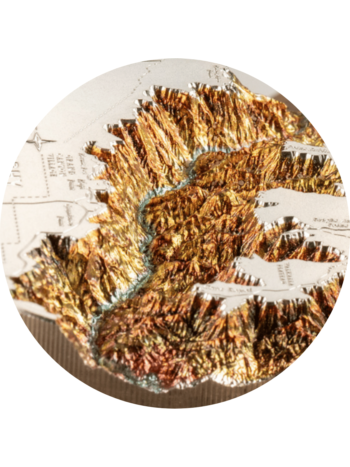 GRAND CANYON 5 Oz Silver coin is dedicated to the Grand Canyon and it is centered on the main theme of "Topography". The coin has Proof quality and features Smartminting technology, thanks to which the Ultra High Relief conveys a sense of impressive and unsurpassed perfection. The coin comes in a beautiful case, along with the Certificate of Authenticity. This coin stands as a true masterpiece, showcasing cutting-edge Ultra Deep Relief Technology that breathes life into the majestic Grand Canyon. To truly appreciate the exquisite beauty of this coin, we invite you to watch the accompanying video. Limited mintage of only 777 pieces worldwide!