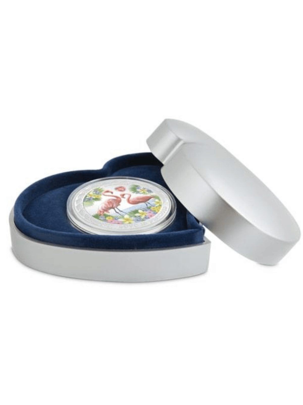 FLAMINGOS Love is Precious 1 Oz Silver coin is part of the wonderful "Love is Precious" series, dedicated to the lovers around the globe. In this edition – the Flamingos. The coin has a beautiful coloration, has an incredible heart-shaped Zirconia insert, has a Proof quality and comes in a heart-shaped case, along with the Certificate of Authenticity. Limited mintage to 3000 pieces worldwide!