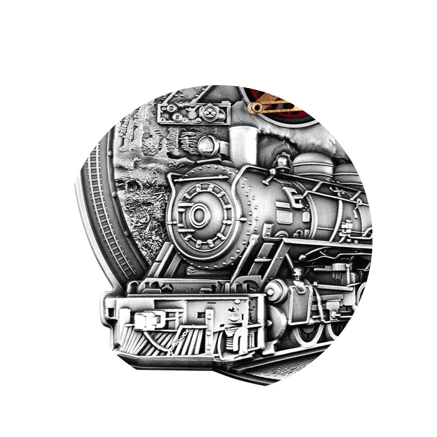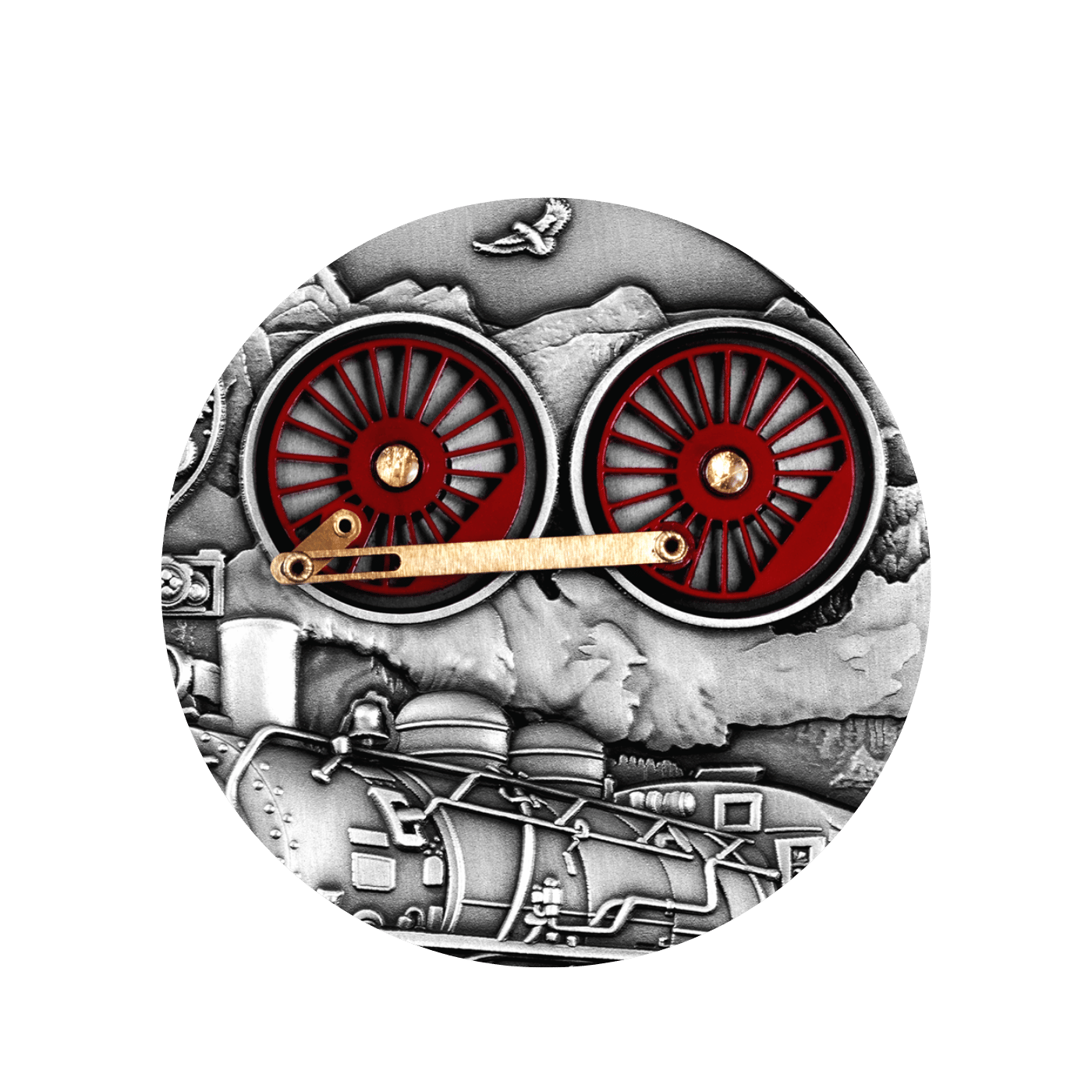 This shaped masterpiece, struck from 10 ounces of pure silver (.999 fine), features two colorized, movable wheels that pay homage to the revolutionary spirit of early steam locomotives. A bold fusion of historical significance and modern embossing artistry, this collectible is a true innovation in numismatic design.