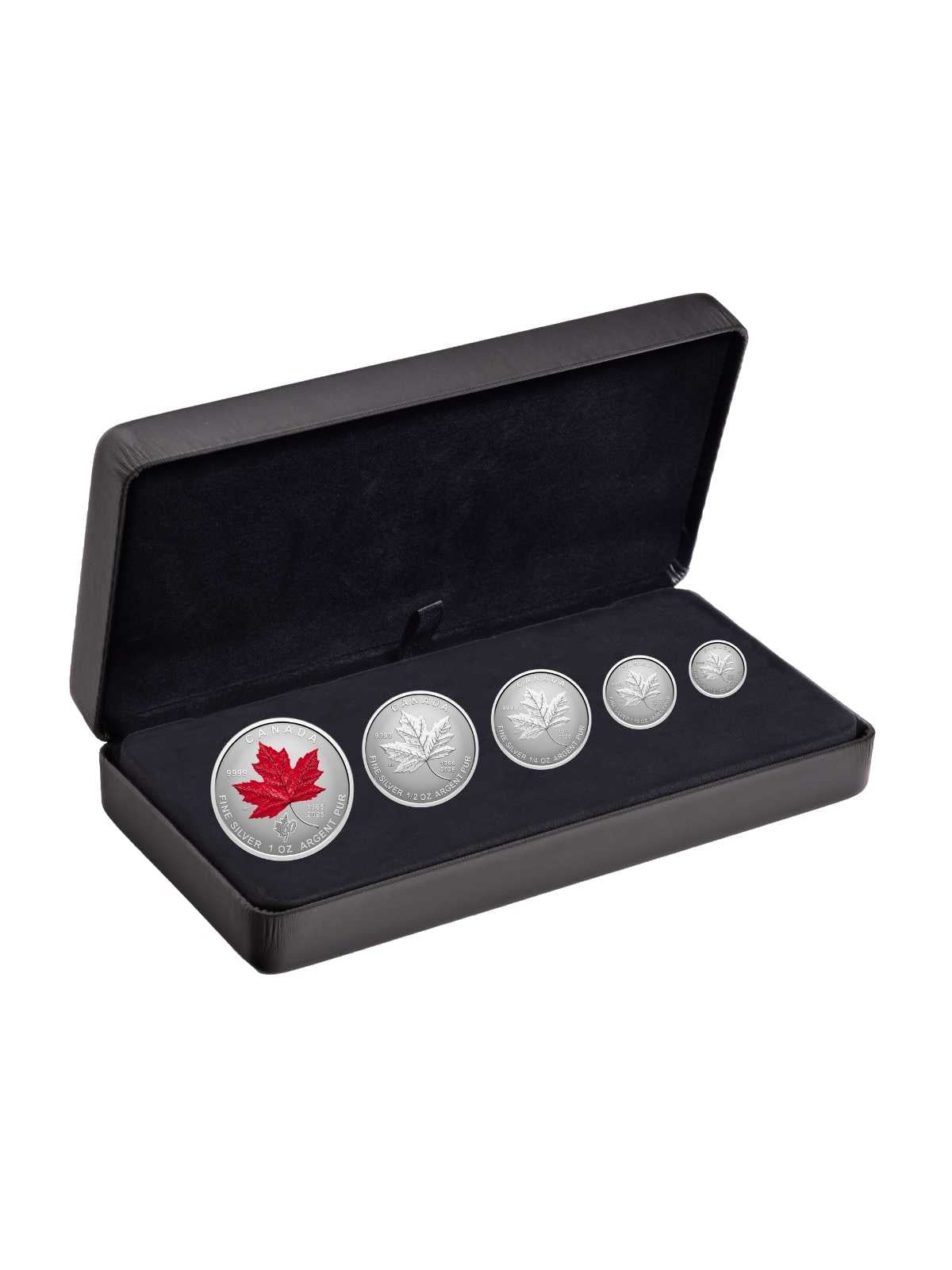- A classic maple leaf. Own a set of five 99.99% pure silver coins, each one bearing a traditionally styled Canadian maple leaf design! An annual offering with a different theme and maple leaf each year, the silver fractional set contains 1 oz. (38 mm), ½ oz. (34 mm), ¼ oz. (27 mm), 1/10 oz. (20 mm) and 1/20 oz. (16 mm) coins.