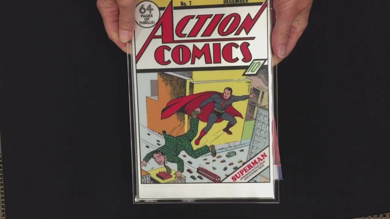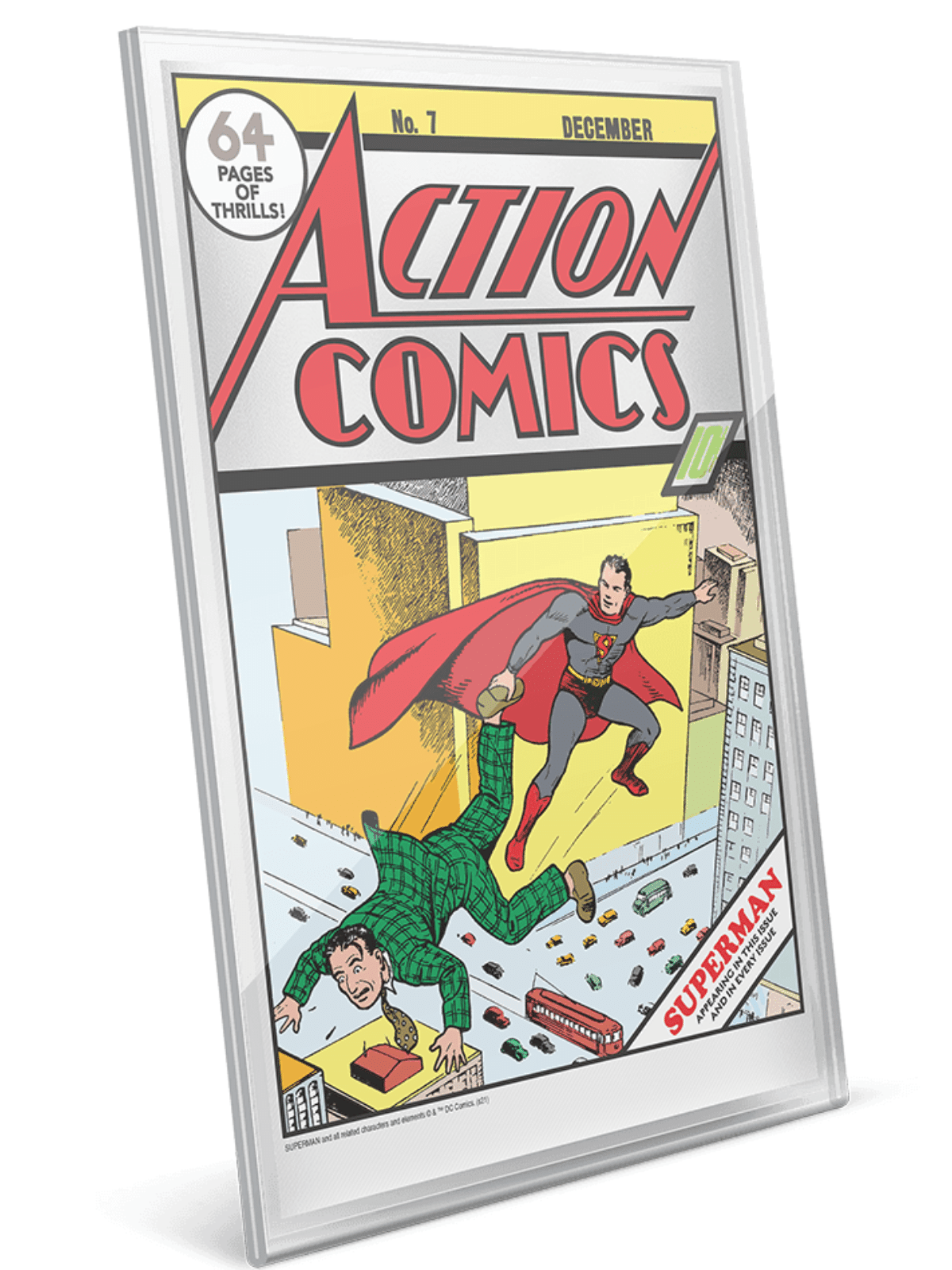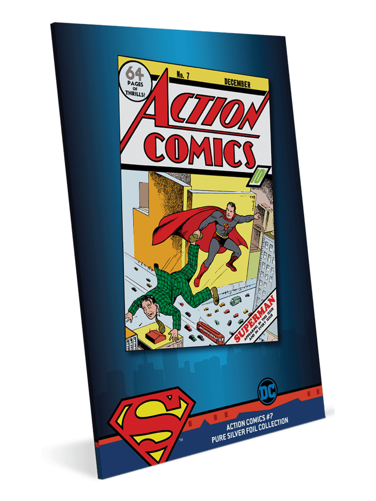 Relive the early days of the Man of Steel with the ACTION COMICS #7 DC Comics Silver Foil. This extraordinary silver foil pays homage to the seventh issue of Action Comics, originally published in December 1938. As the second comic cover to feature the iconic superhero Superman™, it holds a special place among the 25 most valuable comics of all time.