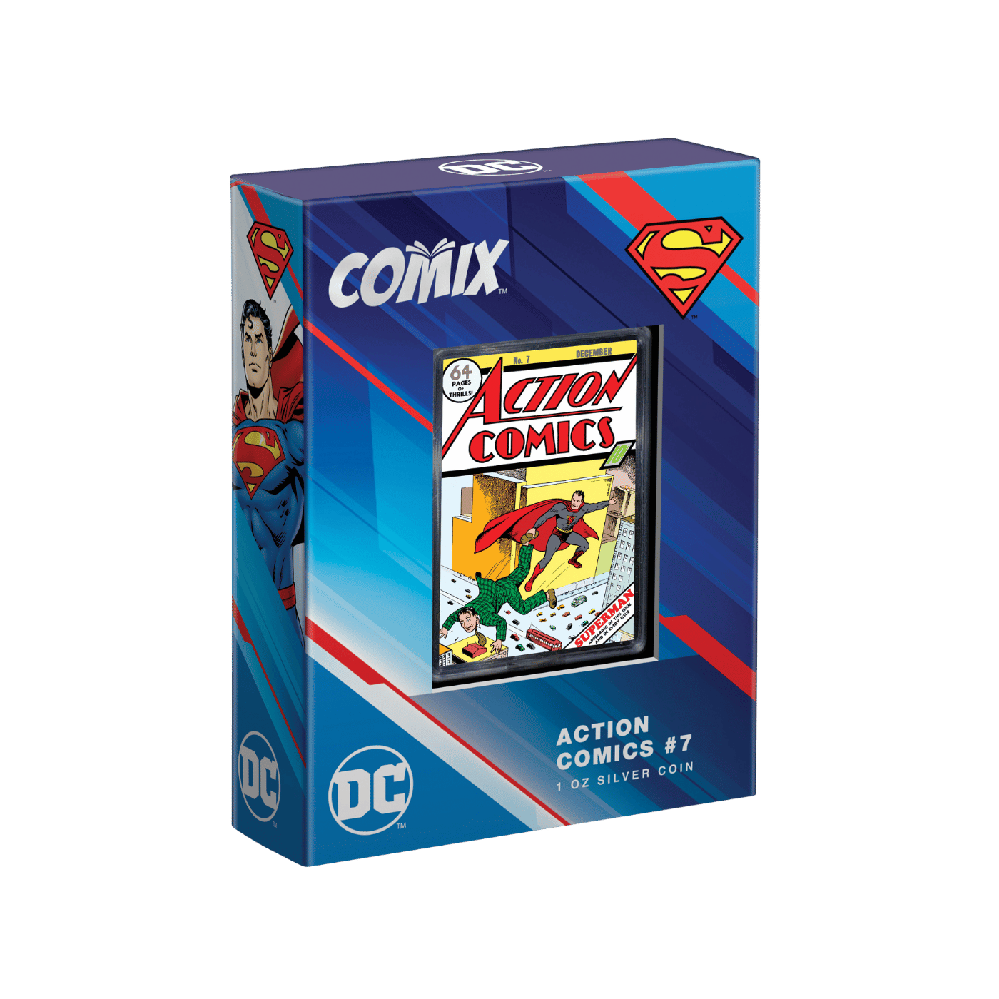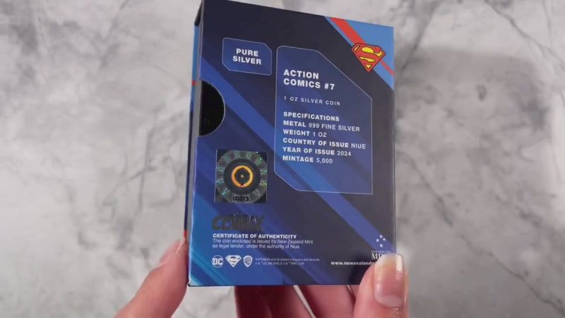 SUPERMAN™ is back on another 1oz pure silver COMIX™ Coin. This time it’s Action Comics #7 which boasts the second-ever cover appearance of the Man of Steel