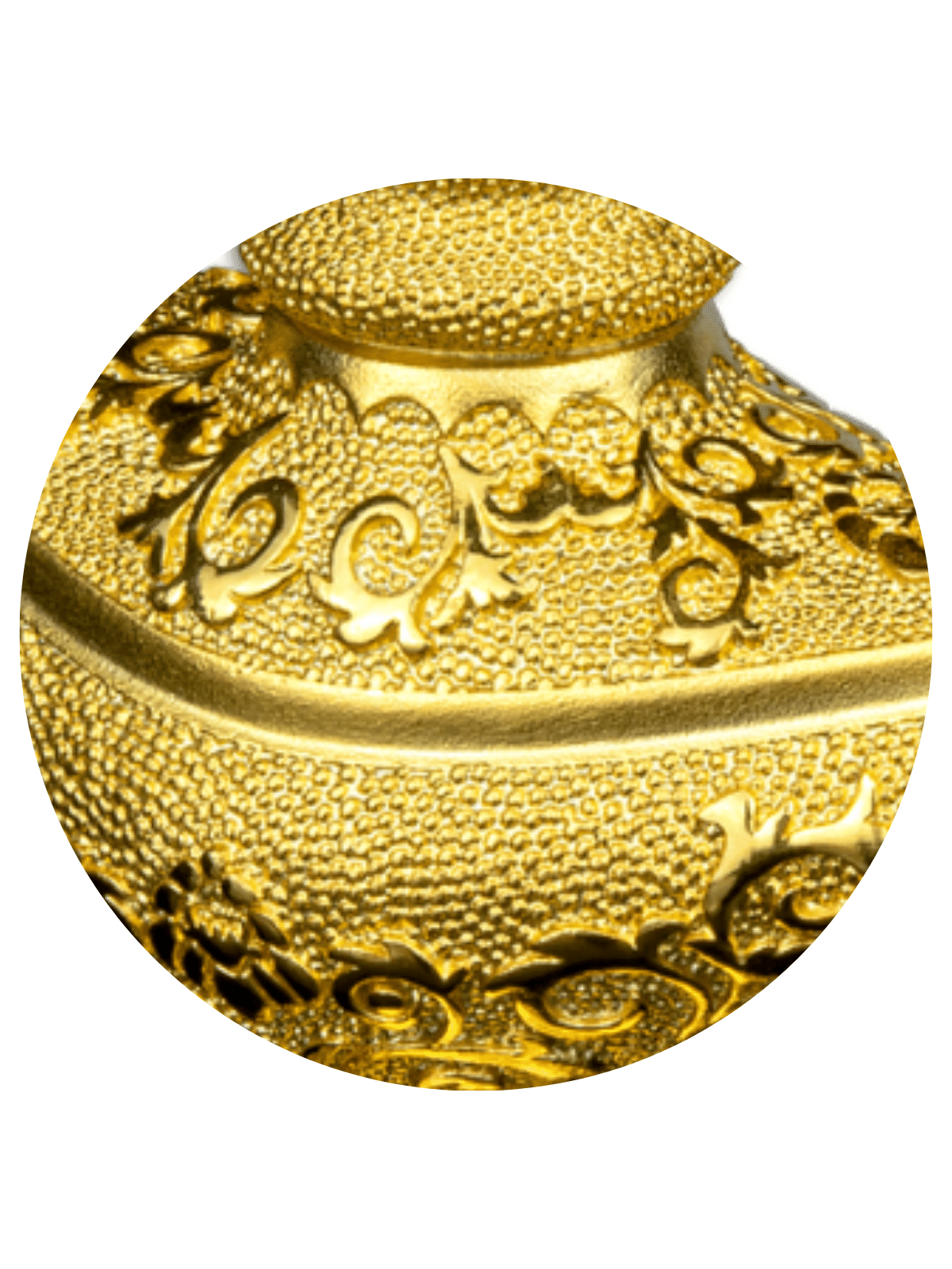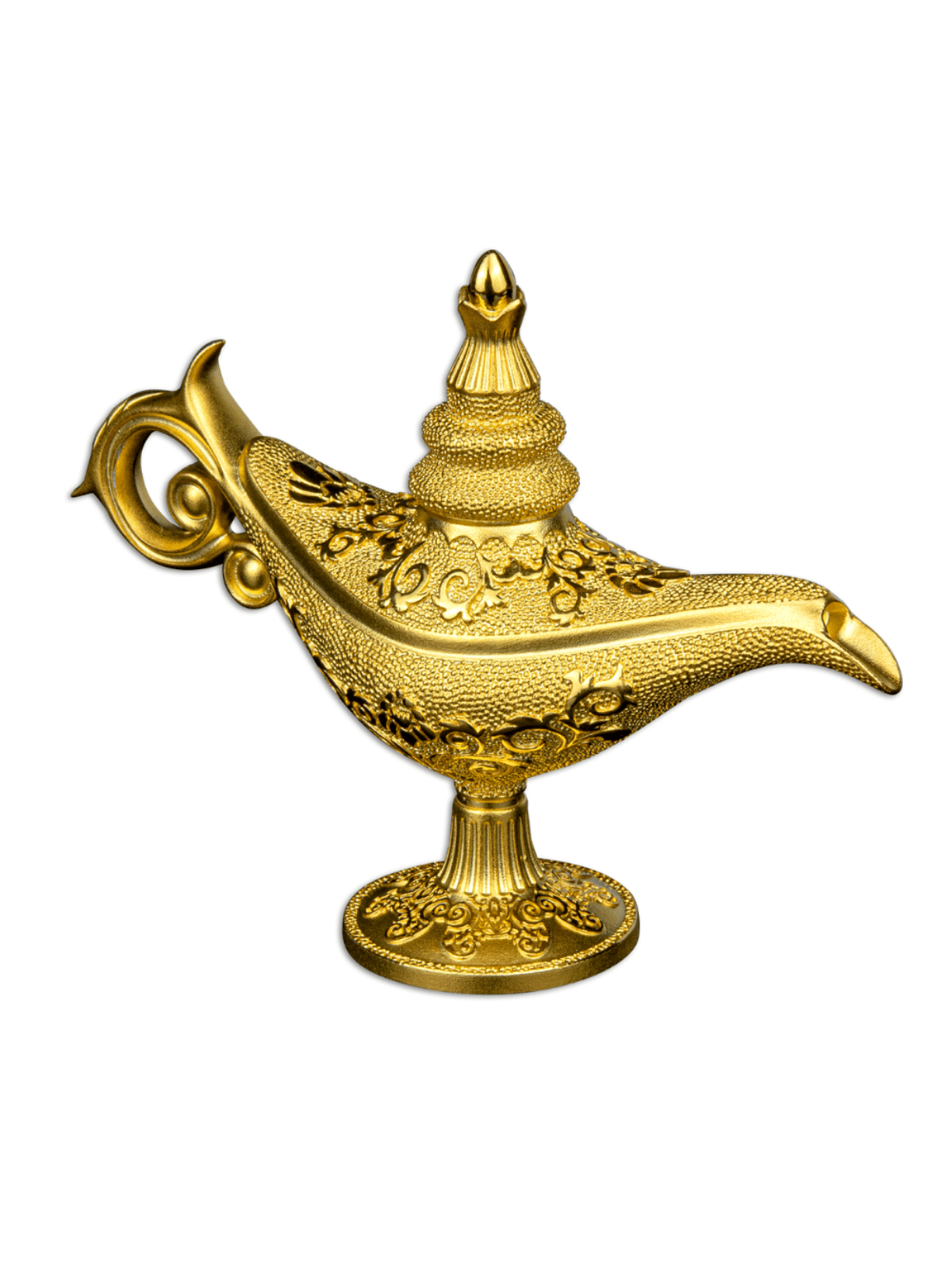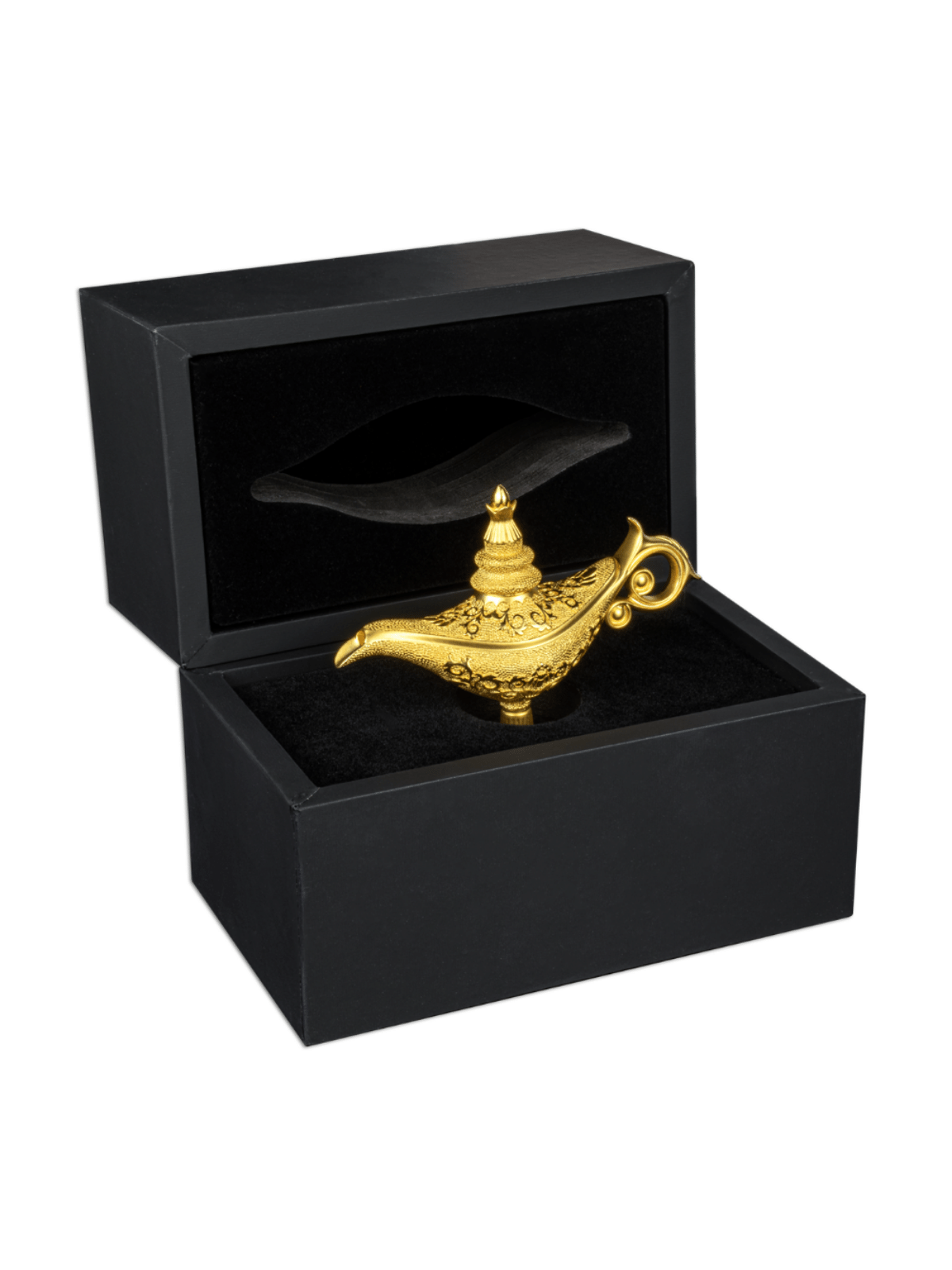 ALADDIN MAGIC LAMP 5 Oz Silver coin is a 3D masterpiece representing the well-known Magic Lamp of Aladdin, which has been used for summoning a genie and make three wishes. The coin has an extraordinary shape and a Gold plating. It comes in a luxury case, along with the Certificate of Authenticity. Limited mintage of 500 pieces worldwide.