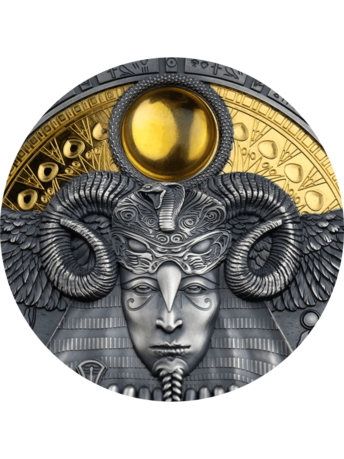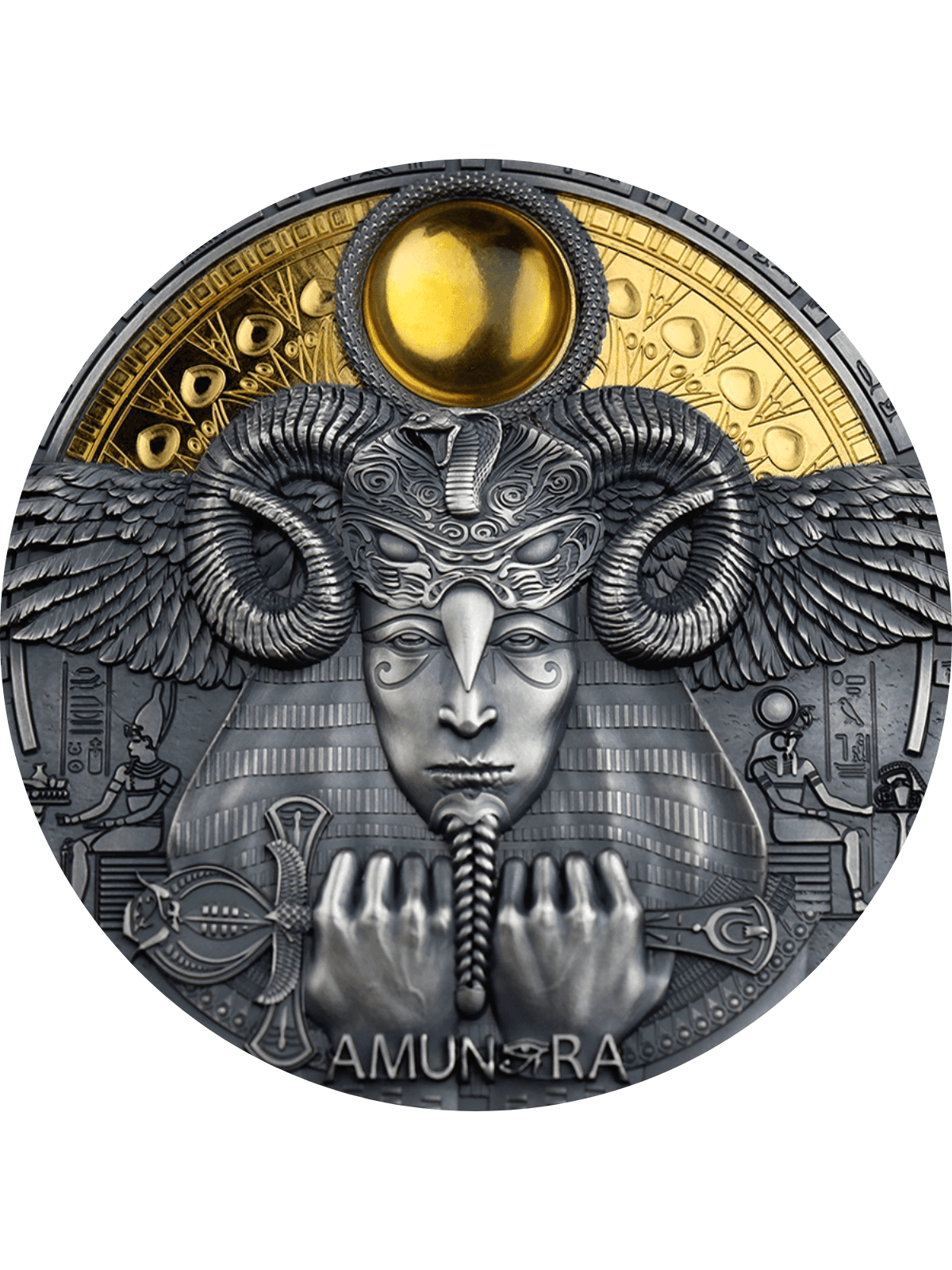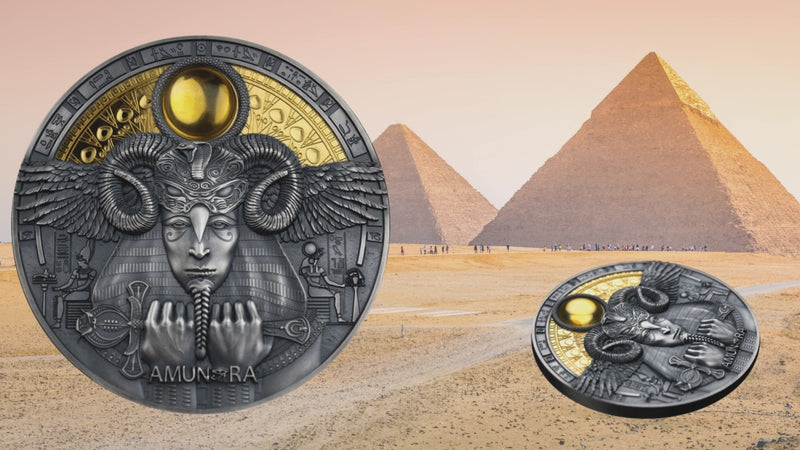 AMUN-RA Divine Faces Of The Sun 3 Oz Silver coin is dedicated to Amun-Ra, the incarnation of two Egyptian gods united : Amun and Ra. The coin has a beautiful amber insert, a high level of details, an Antique Finish and is gold gilded. It comes in a case, along with its Certificate of Authenticity. Limited mintage to only 500 pieces worldwide!