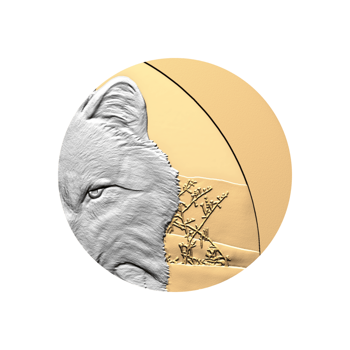 Popular images of the wolf will show it on the prowl with its piercing gaze focused on the viewer, or else howling at a full moon; in reality, the wolf is a social creature that would much rather keep its distance from humans. This is what makes our third Animal Portraits coin so unique: it’s a close view of a wolf at rest, its eyes passively observing its surroundings and its forepaws casually extended outside the framed centre portion to suggest a relaxed state during this rare, unguarded moment.