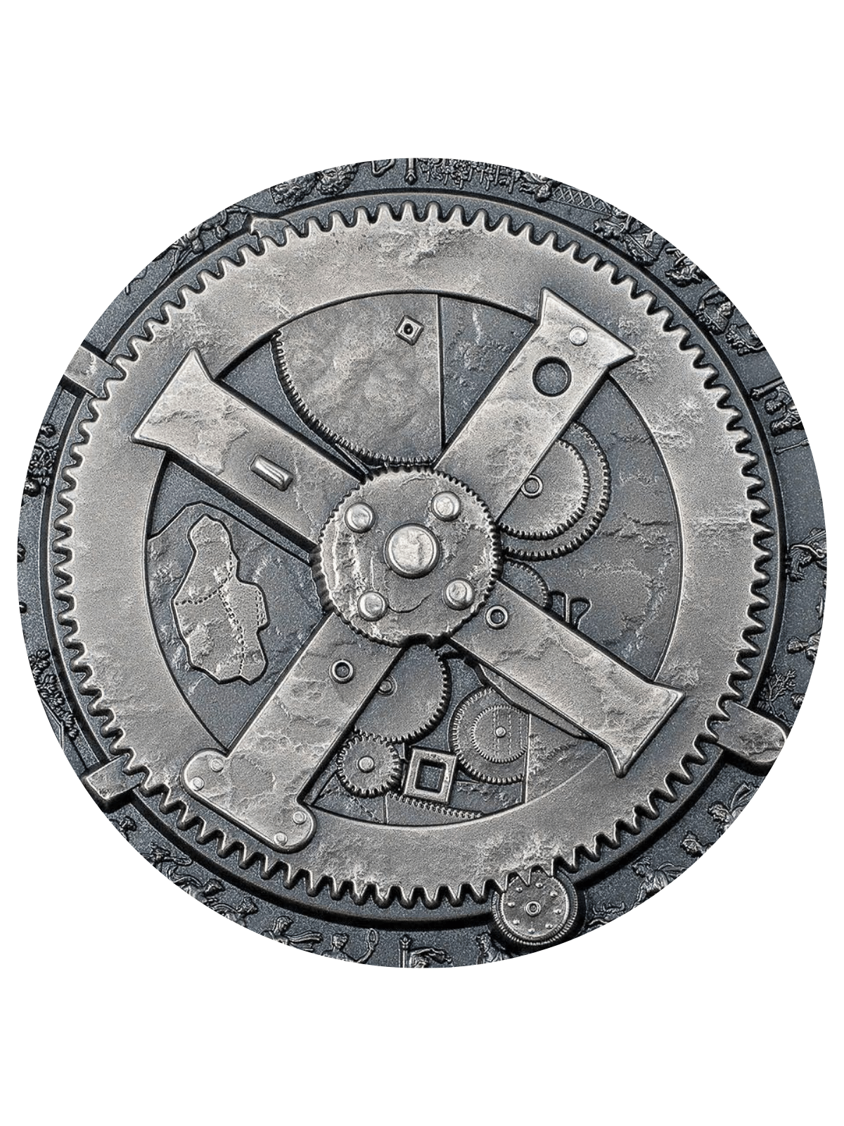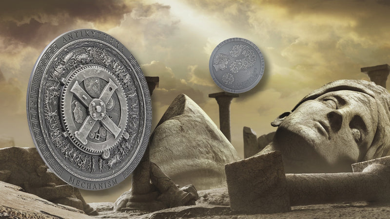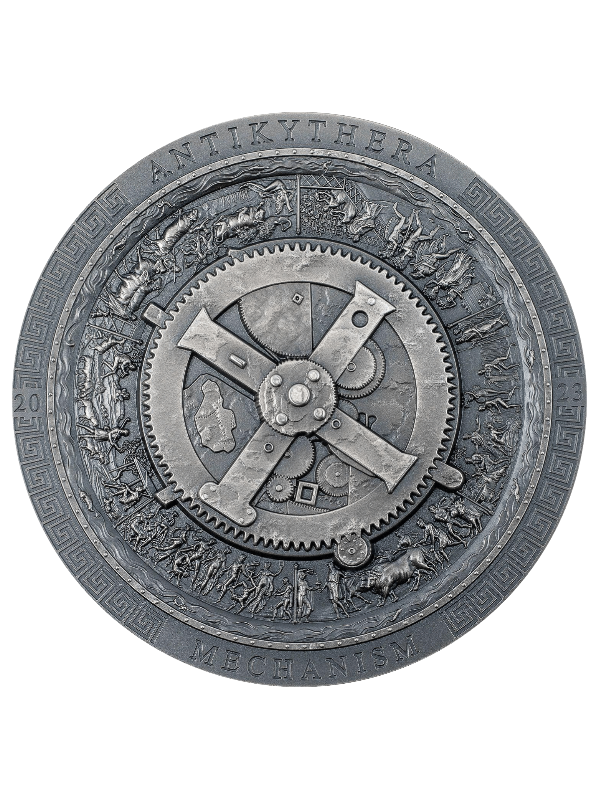 ANTIKYTHERA MECHANISM Antiqued 3 Oz Silver coin is the new release in the “Archeology & Symbolism” series. In this edition: Antikythera Mechanism. The coin features Smartminting© technology, has Antique Finish quality, and comes in a beautiful case, along with the Certificate of Authenticity. Limited mintage of only 333 pieces worldwide!