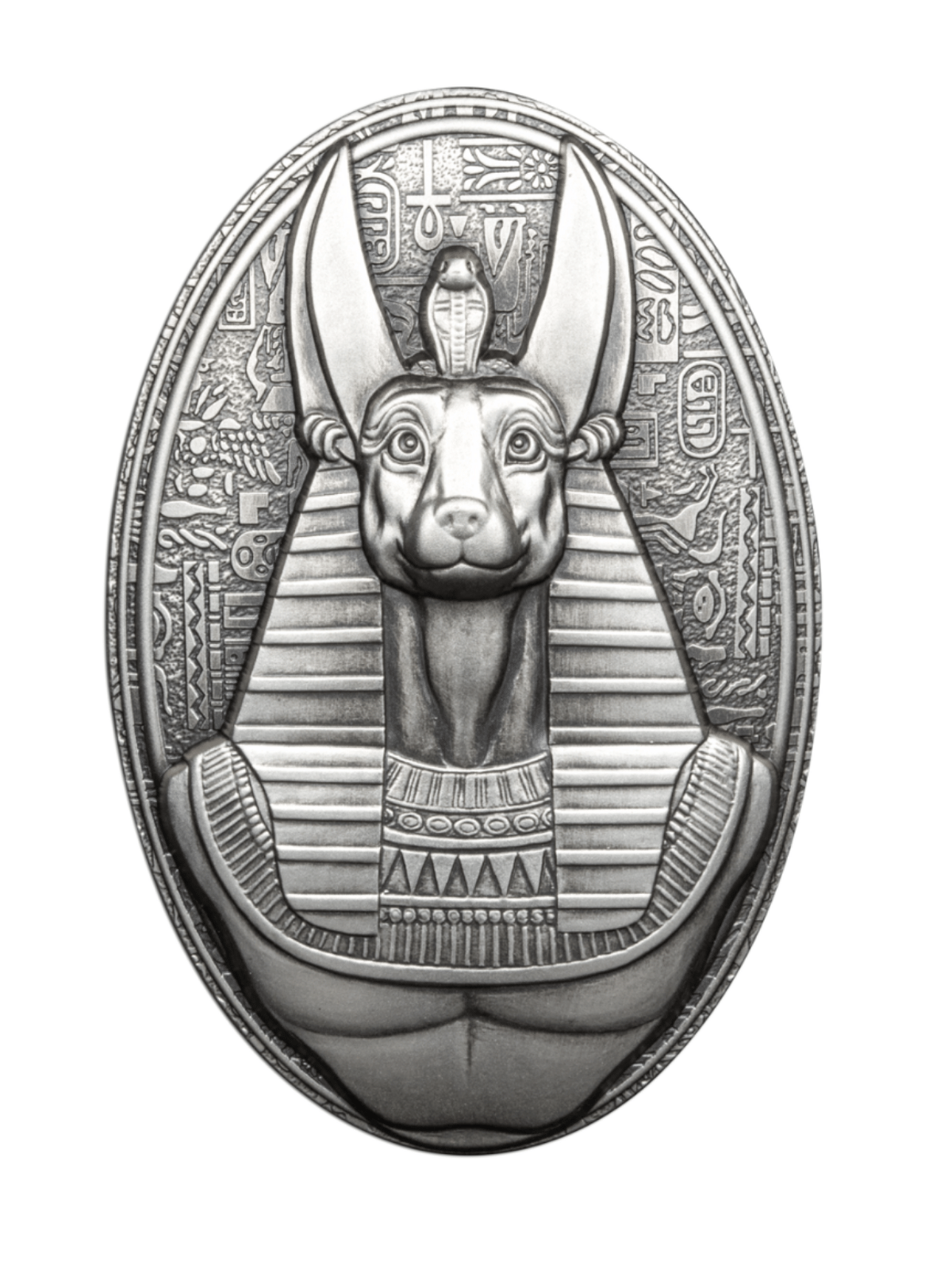 ANUBIS 3 Oz Silver coin celebrates Anubis, the ancient Egyptian god associated with mummification and the afterlife, considered the guardian and guide of the souls of the dead. The coin has a peculiar shape and Antique Finish quality. It comes in a luxury oval case, along with the Certificate of Authenticity. Limited mintage of 1999 pieces worldwide!
