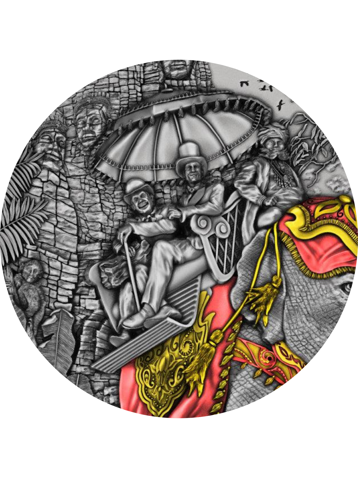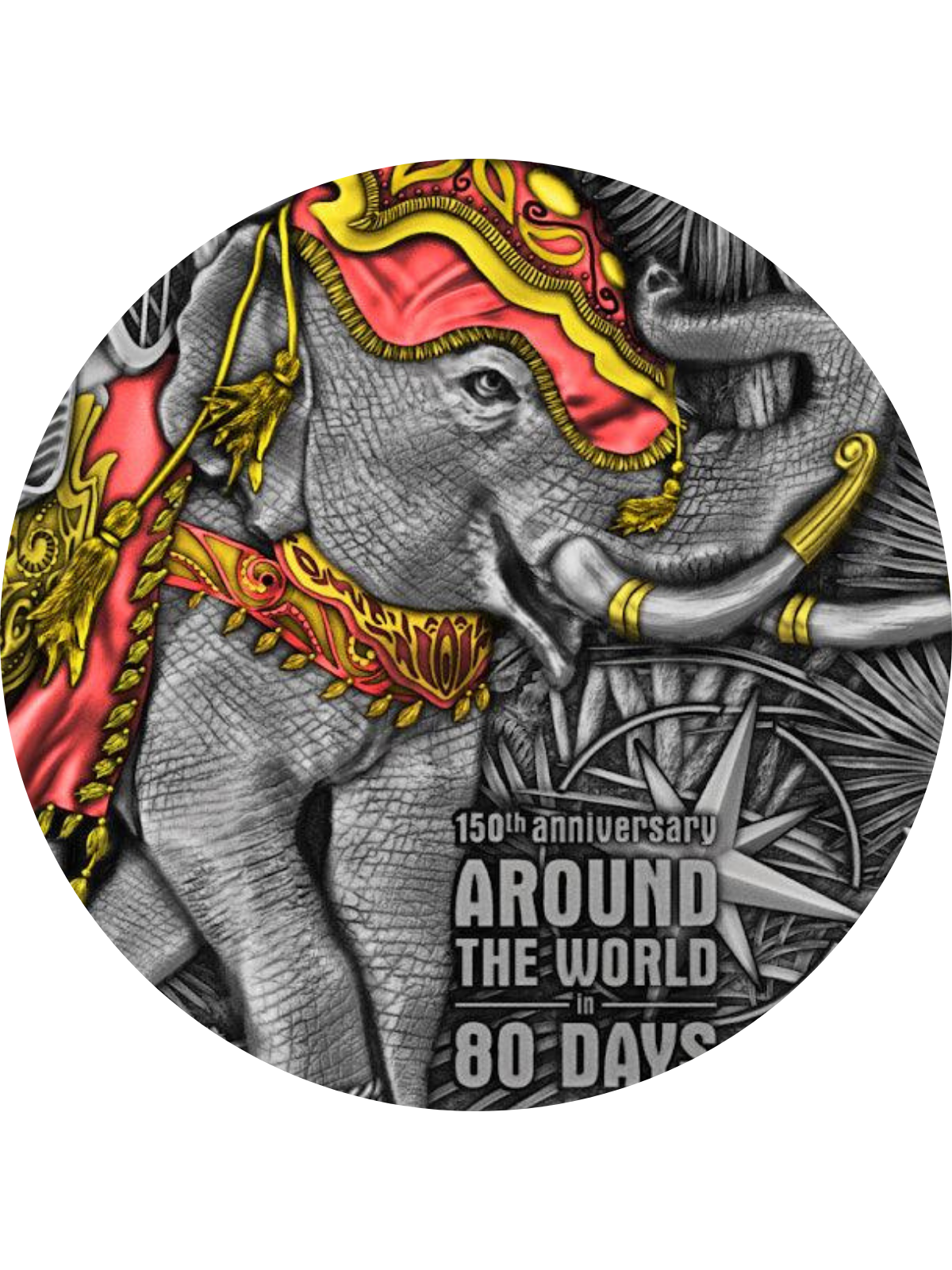 AROUND THE WORLD IN 80 DAYS 3 Oz Silver coin commemorates the 150th Anniversary of the publication of French writer Jules Verne's major literary work: Around the World in Eighty Days. The coin has a beautiful High Relief, a selective coloration and an Antique Finish quality and comes in a case, along with the Certificate of Authenticity. Limited mintage of 500 pieces worldwide!