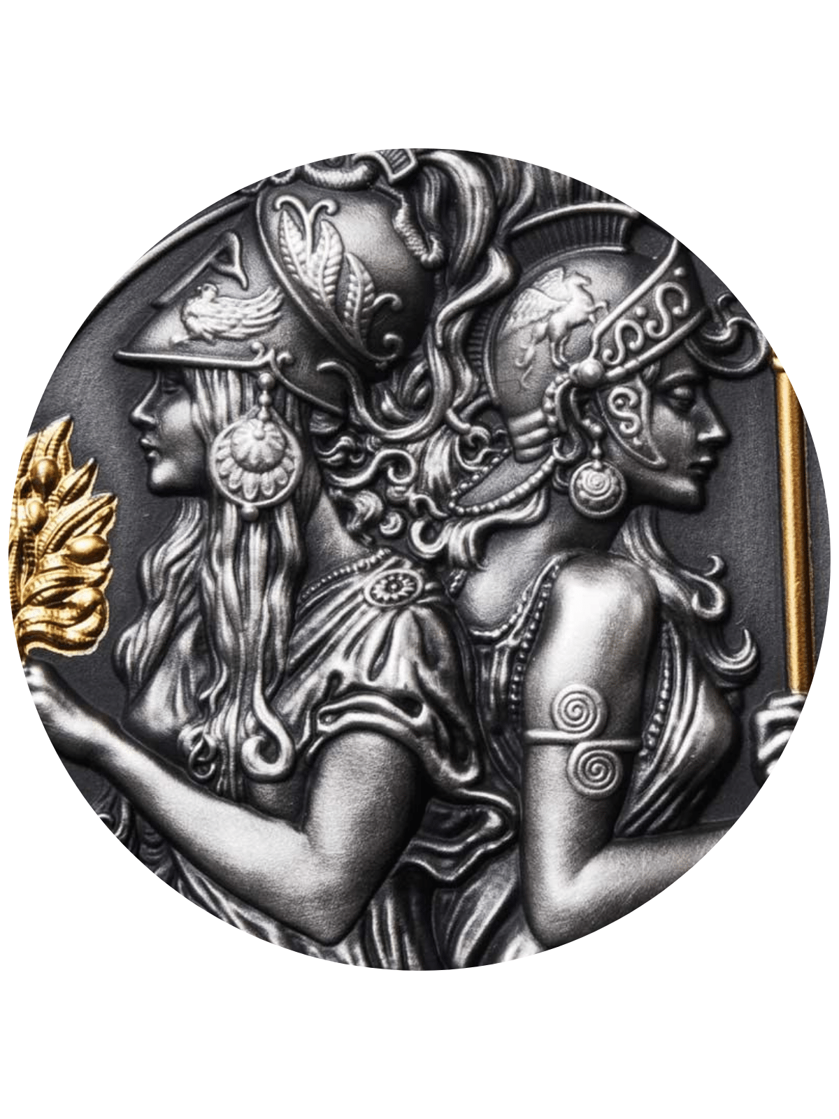 ATHENA AND MINERVA Strong and Beautiful Goddesses 2 Oz Silver coin is the second issue in the new "Strong and Beautiful Goddesses" series, dedicated to the goddesses Athena and Minerva. The coin presents wonderful and detailed Ultra High Reliefs, has a selective Gold plating, has an Antique Finish quality and comes in a wooden case, along with the Certificate of Authenticity. Limited mintage of only 500 pieces worldwide!
