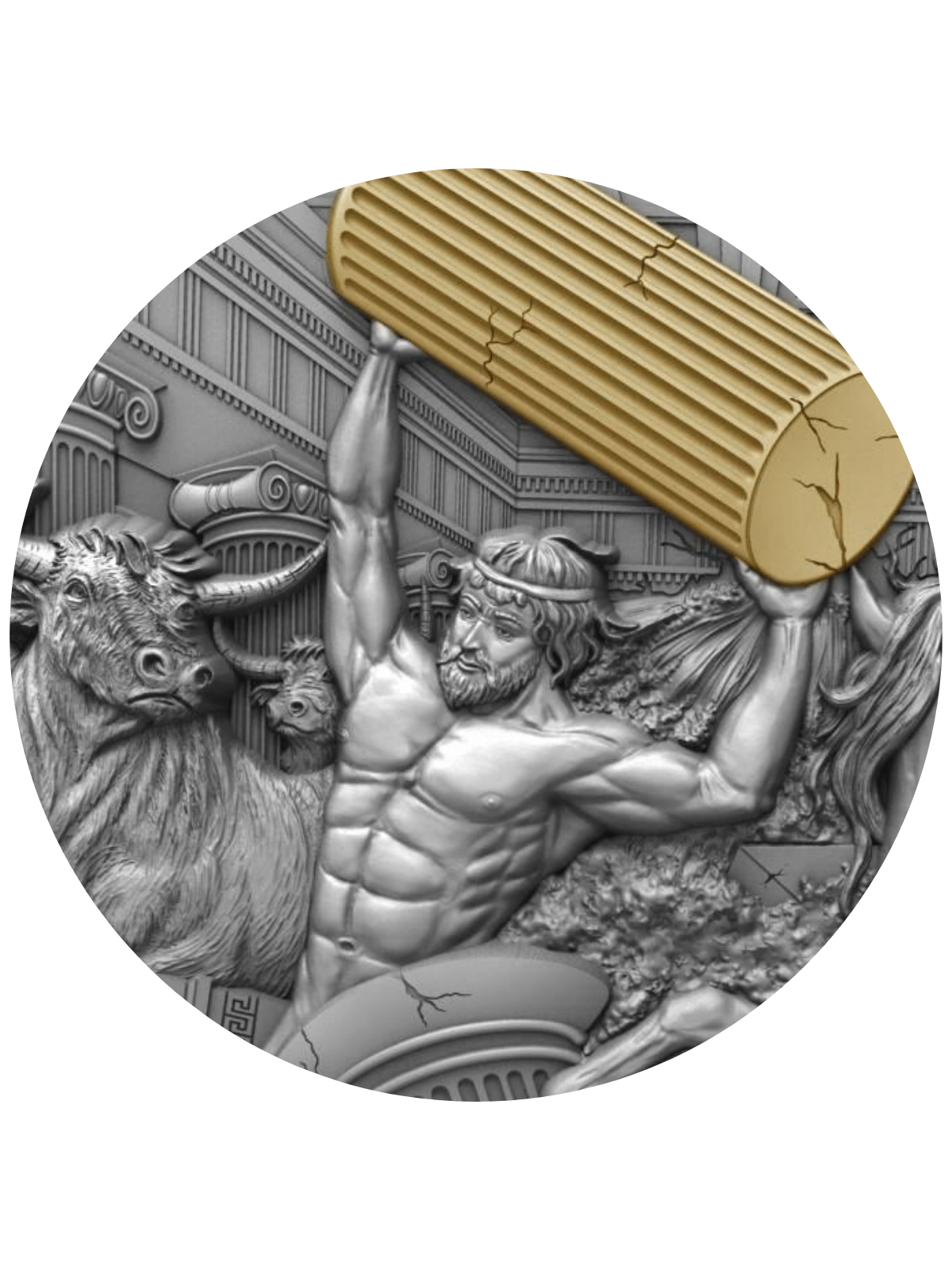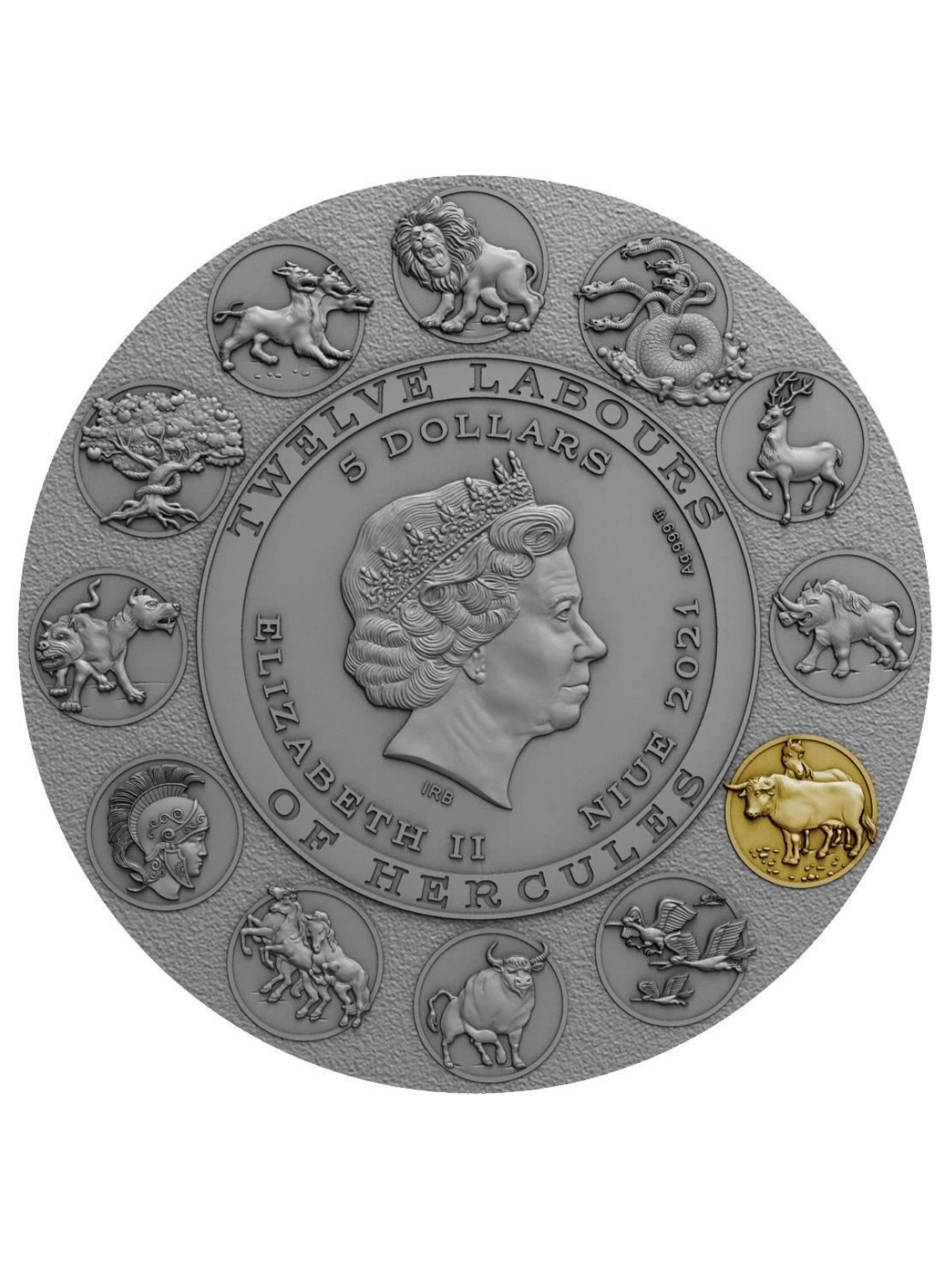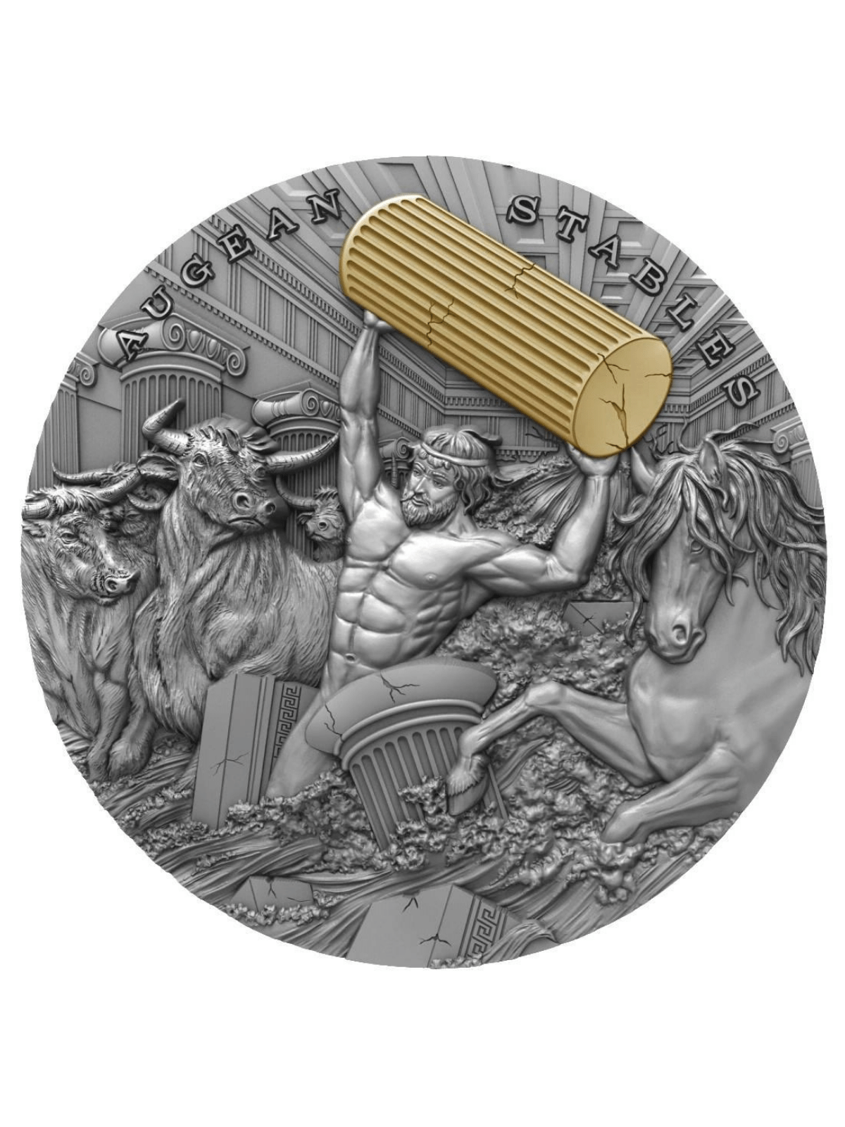 AUGEAN STABLES Twelve Labours of Hercules 2 Oz Silver coin is the fifth release in the “Twelve Labours of Hercules” series, dedicated to one of the Twelve Labours – Augean Stables. The coin features a beautiful Gold plating, has a great High Relief, has an Antique Finish quality and comes in a themed case, along with the Certificate of Authenticity. Limited mintage to only 500 pieces worldwide!