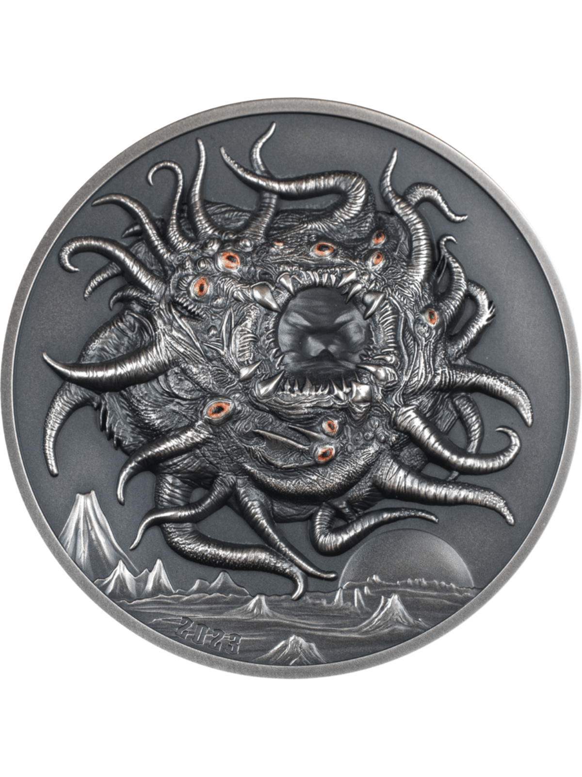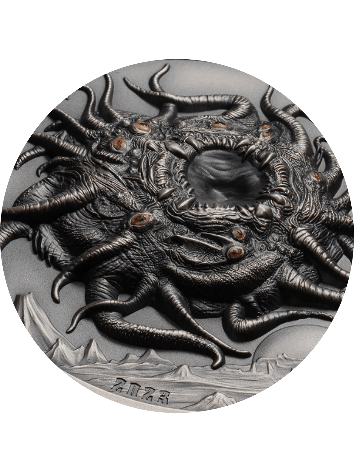 AZATHOTH 3 Oz Silver coin is a tribute to Howard Phillips Lovecraft, an American author of Gothic tales and features one of his best known stories: the Azathoth. The coin has an impressive Smartminting Ultra High Relief, has an Antique Finish quality, has a selective coloration. It comes in a case, along with the Certificate of Authenticity. Limited mintage of 750 pieces worldwide!