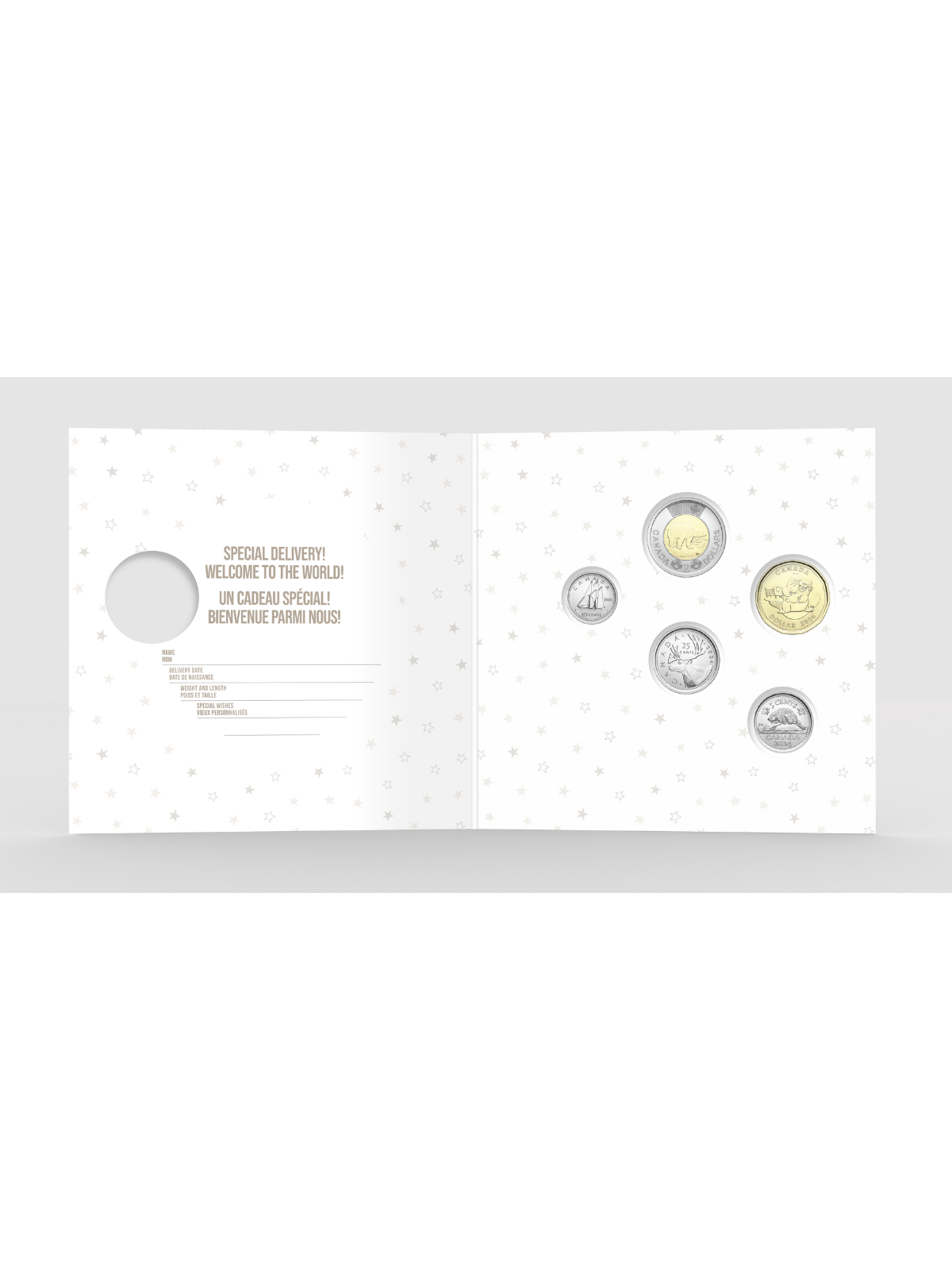 Introducing the 2024 Baby Gift Card Set – the perfect way to extend your warmest welcome to the newest addition to the family! This adorable five-coin set is designed to celebrate the joyous occasion of a baby's birth in 2024, making it a unique and thoughtful gift for new parents. Presented in gender-neutral packaging, the set includes an exclusive $1 uncirculated Canadian coin featuring an endearing nursery scene and the iconic Canadian beaver.