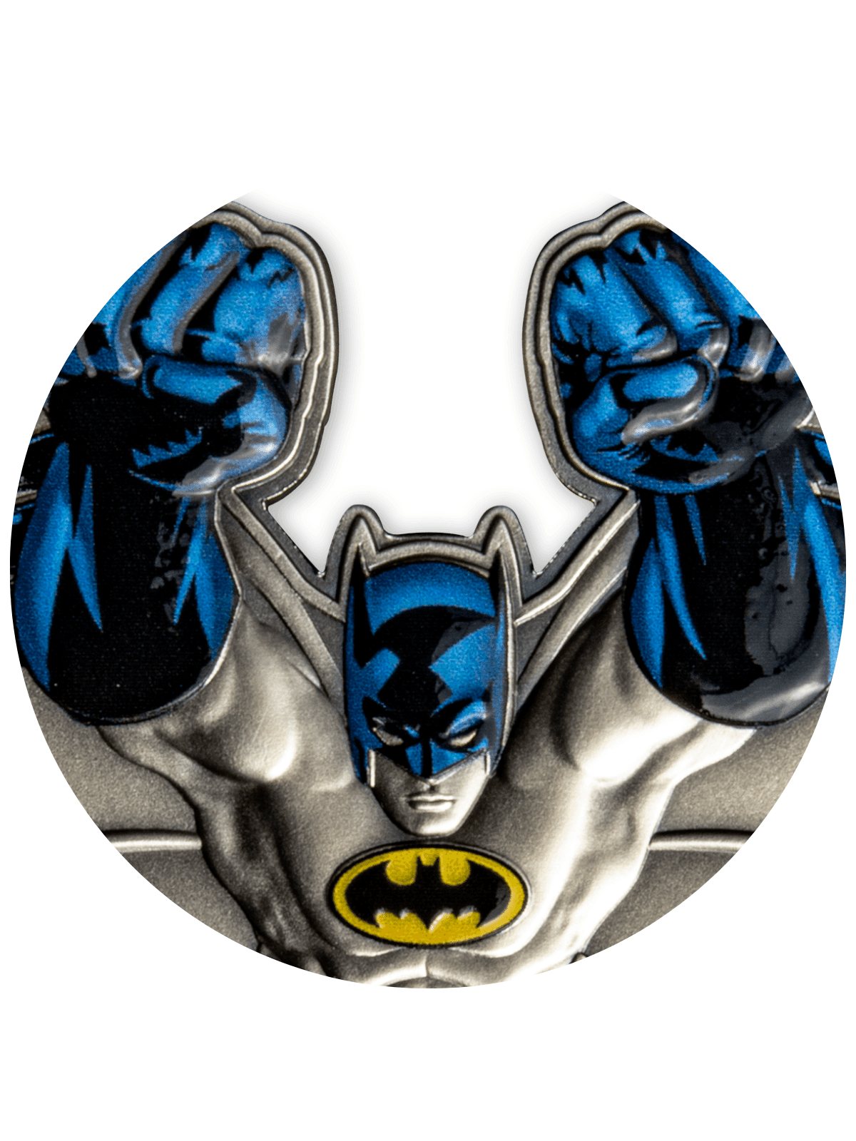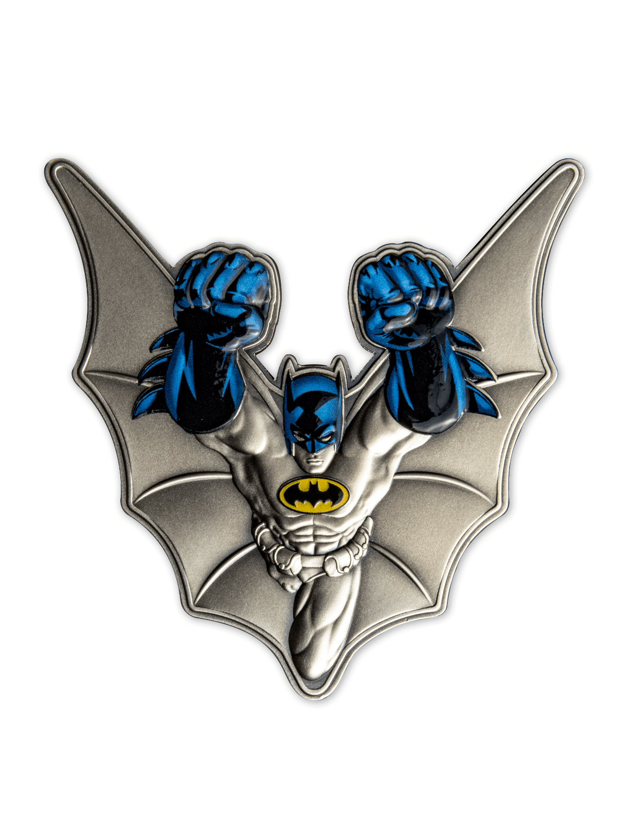 BATMAN 5 Oz Silver coin is dedicated to one of the most popular superheroes of the DC Comic Universe: Batman. The coin has a wonderful coloration, has a special shape, has Antique Finish quality and comes in a case, along with the Certificate of Authenticity. Limited mintage to 750 pieces worldwide!