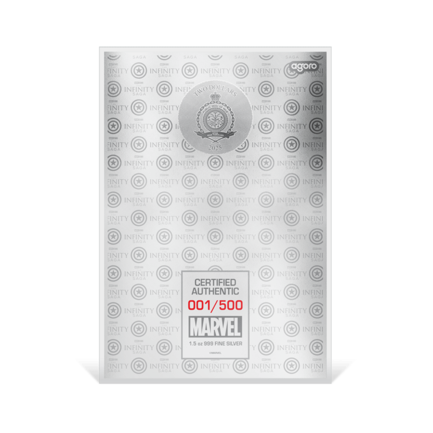 The third Marvel The Infinity Saga foil pays homage to one of the mightiest heroes in the Marvel Universe. Captain America fights for freedom as the ultimate weapon against evil. Now, this shining sentinel of liberty is featured on 1.5oz 999 pure silver.
