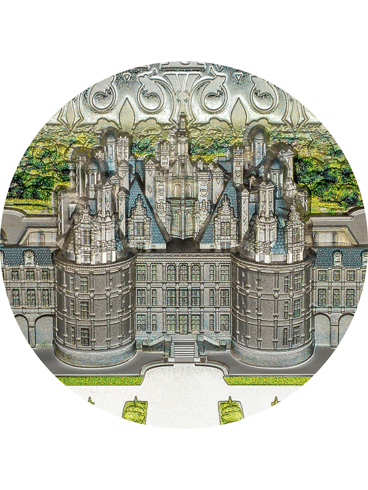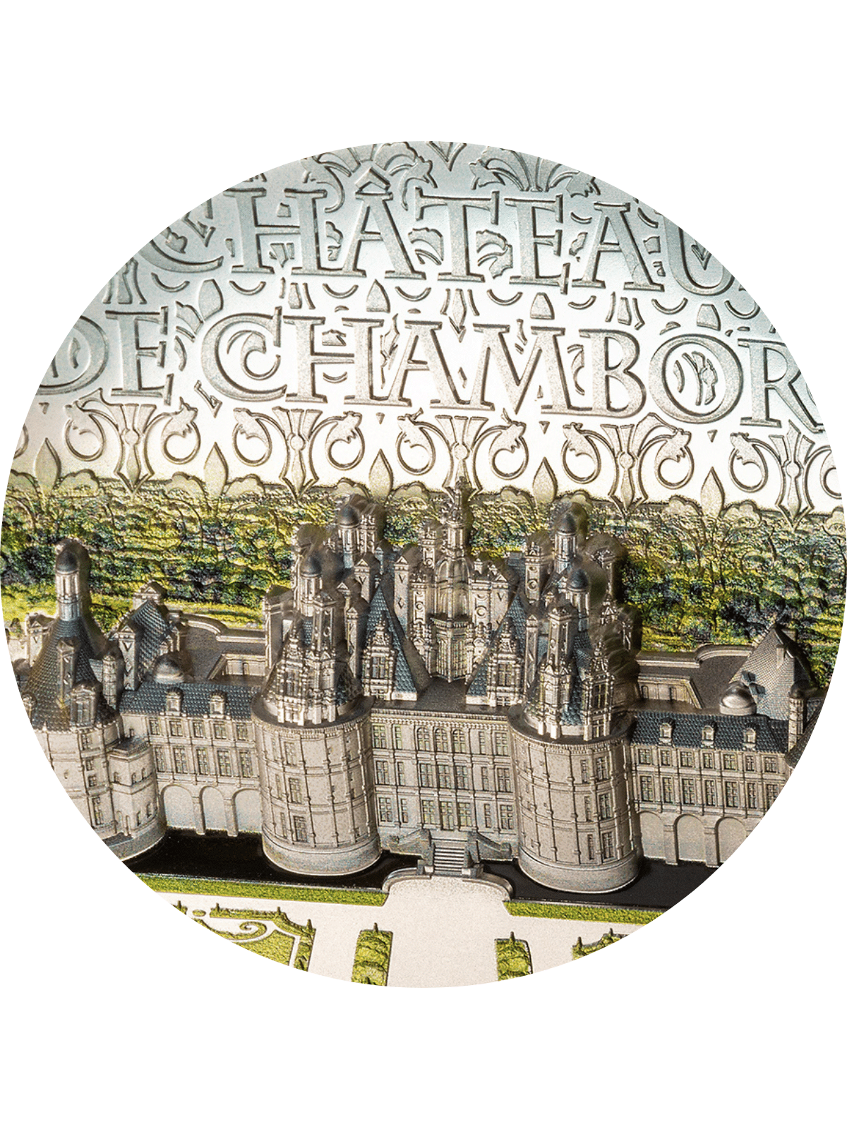 Experience the grandeur and rich history of the renowned "Château de Chambord" with the 5 Oz Silver Coin, a breathtaking tribute to this architectural masterpiece located in the enchanting Loire Valley of France