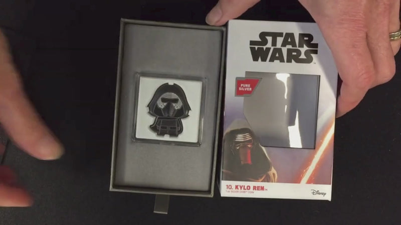 Made from 1oz of pure silver, the coin has been shaped and coloured to feature Kylo in his menacing helmet and black robes.