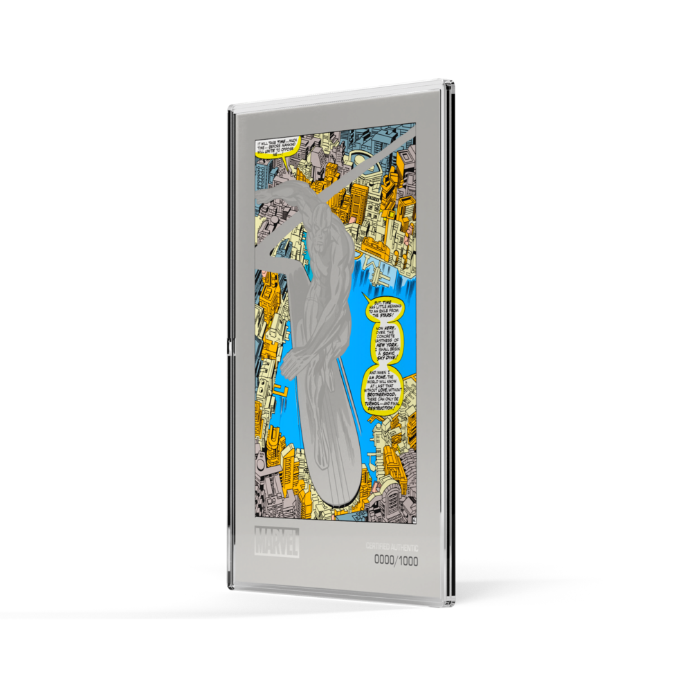 On the front, the Silver Surfer soars above Earth, framed by his introspective dialogue from the original issue. Flip the foil to reveal the continuation of the story in engraved silver, as the Surfer crashes into the Baxter Building and the battle begins. Part of Agoro’s COMIX™ Silver Foil Series, this limited-edition release celebrates the artistry, imagination, and legacy that made Marvel a global phenomenon.