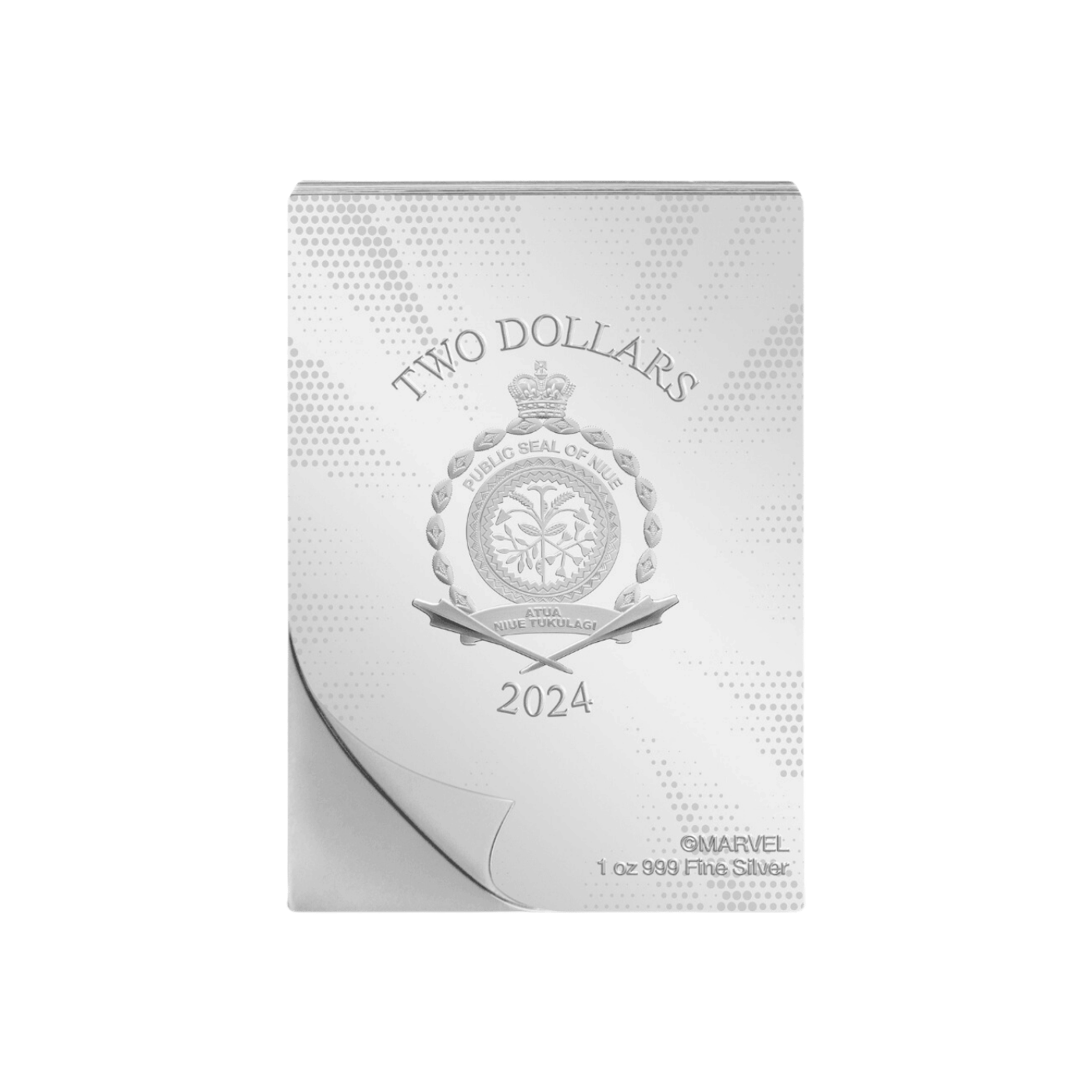 The Public Seal of Niue guarantees its legal tender status, while the engraved page flip keeps the comic feel.