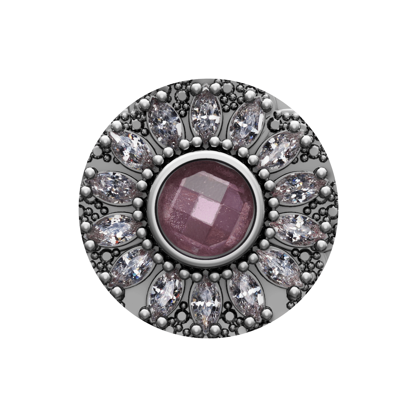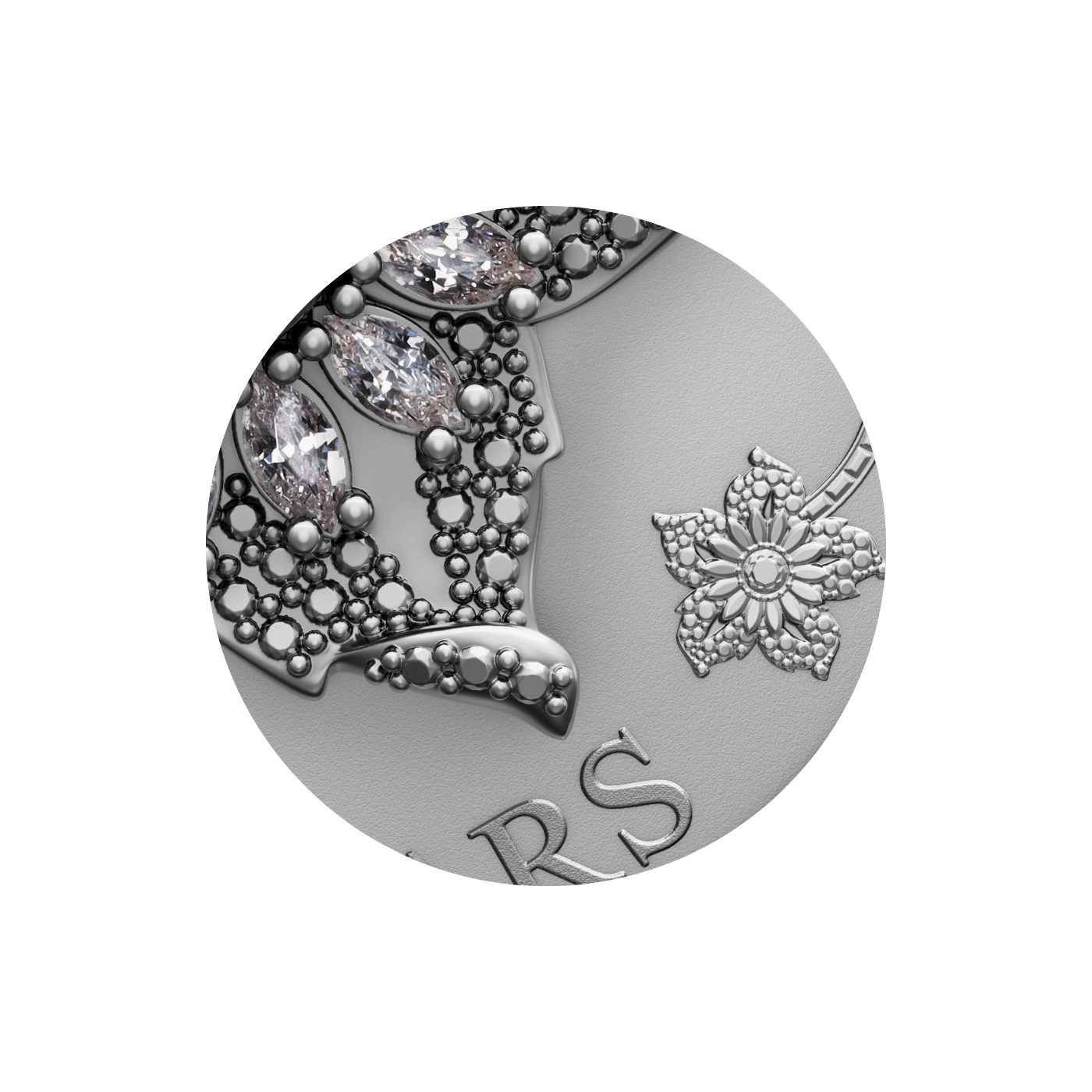 The coin’s reverse features the jonquil flower motif of the brooch, set with rhodium-plated relief, sparkling crystals, and a coloured glass stone to emulate the extraordinary pink diamond centerpiece. -