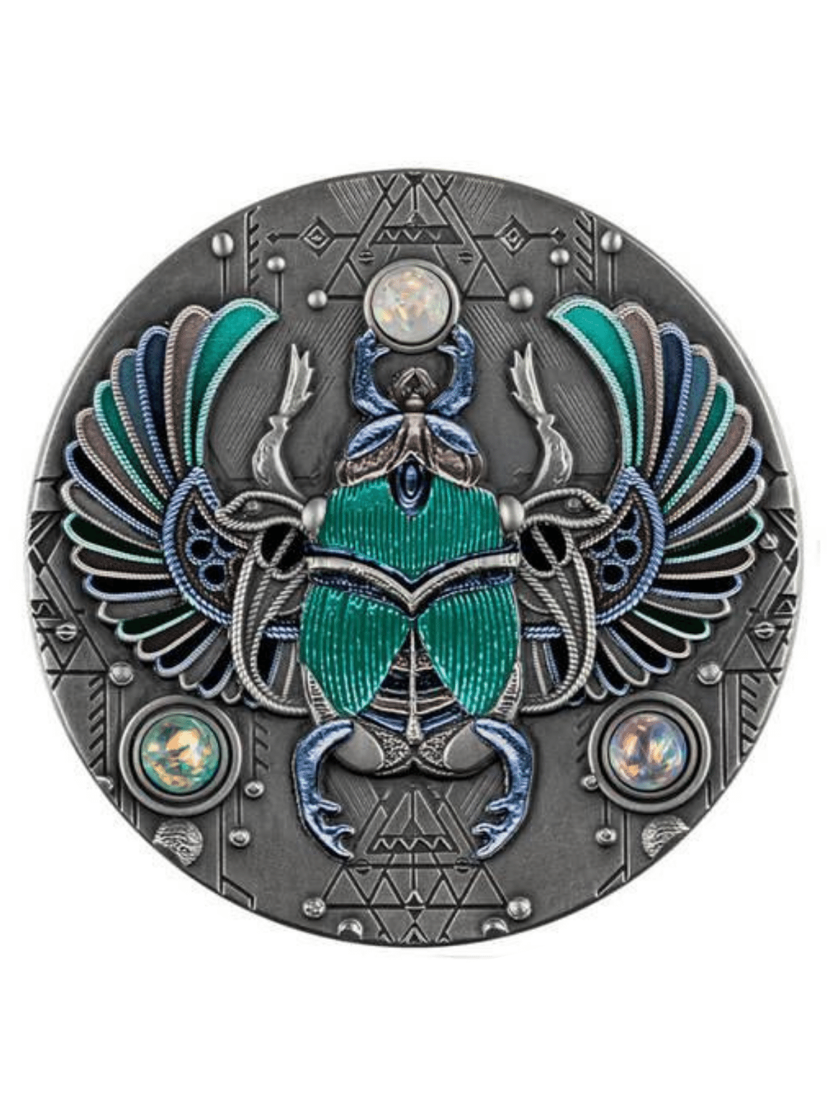 CRYSTAL SCARABAEUS 2 Oz Silver coin is dedicated to the Scarabaeus, an ancient symbol of rebirth and of divinity. The coin features wonderful Crystal inserts, has a beautiful coloration, an Antique Finish quality, a beautiful High Relief and comes in a case, along with the Certificate of Authenticity. Limited mintage to 500 pieces worldwide!