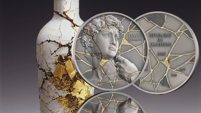 'David,' the premier coin from the new Kintsugi Art collection, reimagines Michelangelo's iconic sculpture through the lens of Japanese artistry. Gilded cracks, inspired by the ancient Kintsugi technique, weave across the design, transforming the classical sculpture into a modern blend of art forms. This 2-ounce high-relief coin captivates with its intricate details, where the fusion of classical Renaissance art and Kintsugi philosophy creates a stunning contrast for the new age. Extremely limited to 299 pieces worldwide, it stands as a testament to MINT XXI’s Premium Coinage Art.