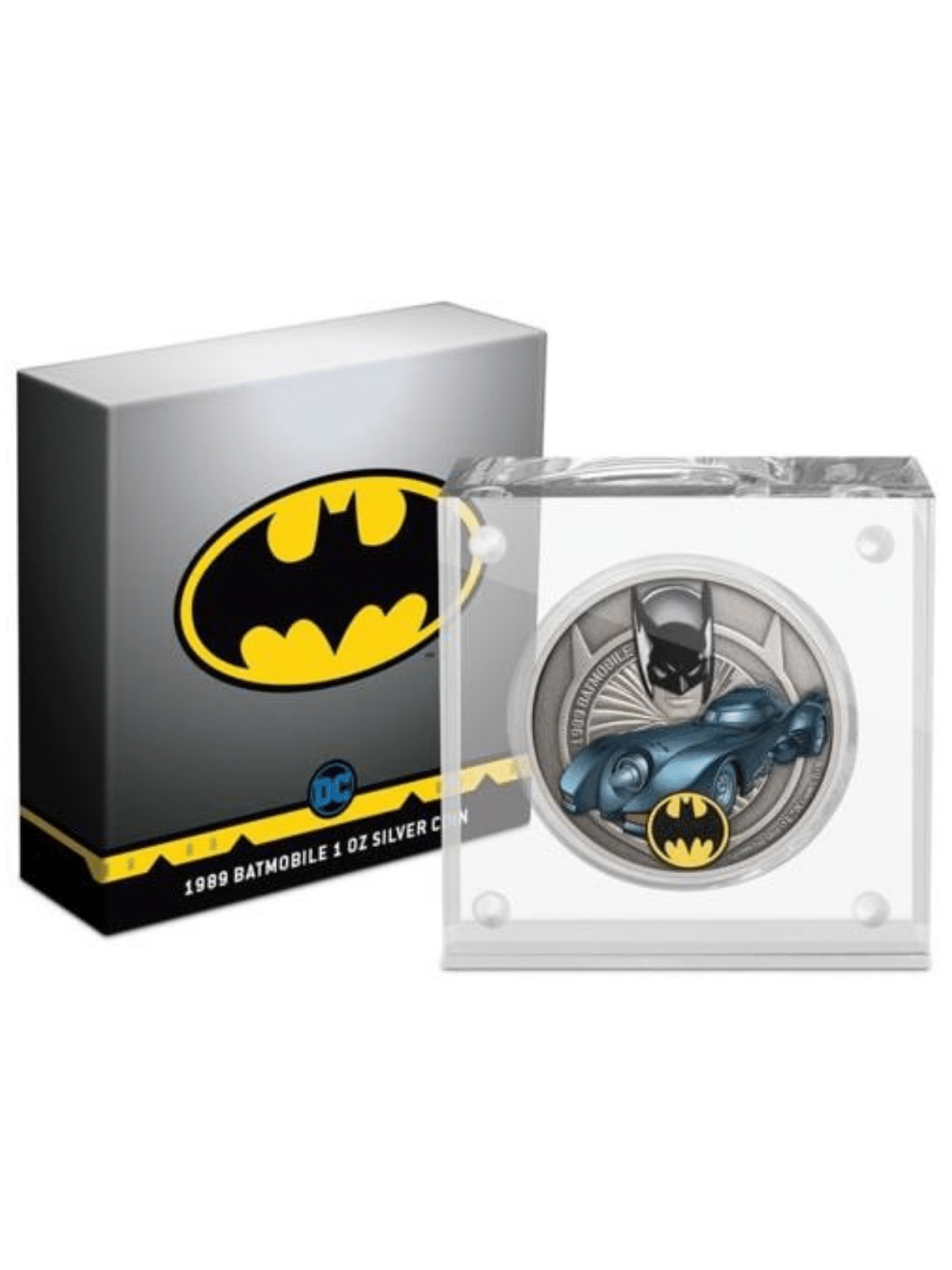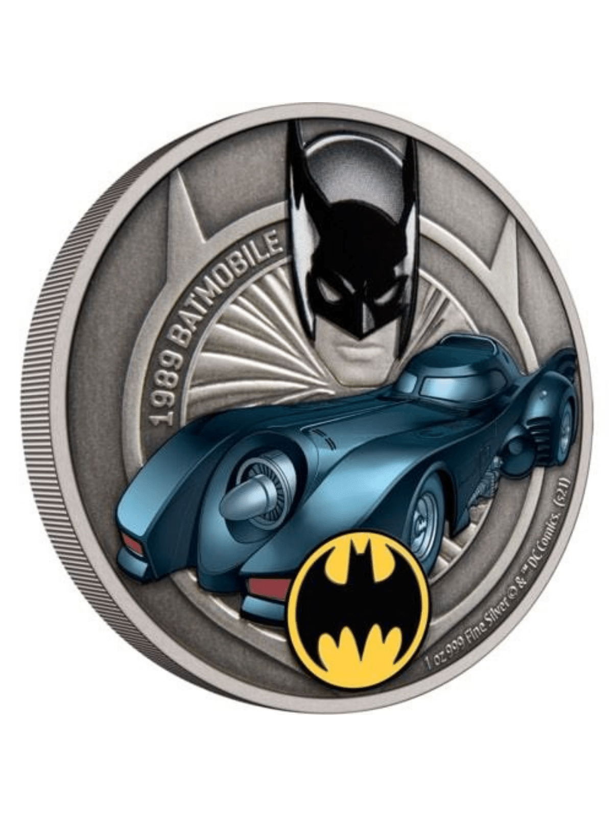 BATMOBILE 1989 DC Comics 1 Oz Silver coin is dedicated to the Batmobile from the 1989 movie Batman™. The coin has a beautiful coloration, an Antique Finish and an incredible design, it comes in a themed case, along with the Certificate of Authenticity. Limited mintage to 2000 pieces worldwide!