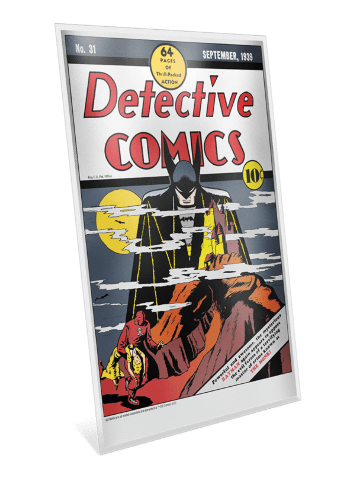 DETECTIVE COMICS Silver note commemorates the first appearance of Batman from May 1939 and is licensed by DC Comics. It features a replica of the thrilling Detective Comics #27 cover and incorporates both colour and engraving. The note has a beautiful foil shape and comes in a Star Trek collectors sleeve, along with the Certificate of Authenticity.