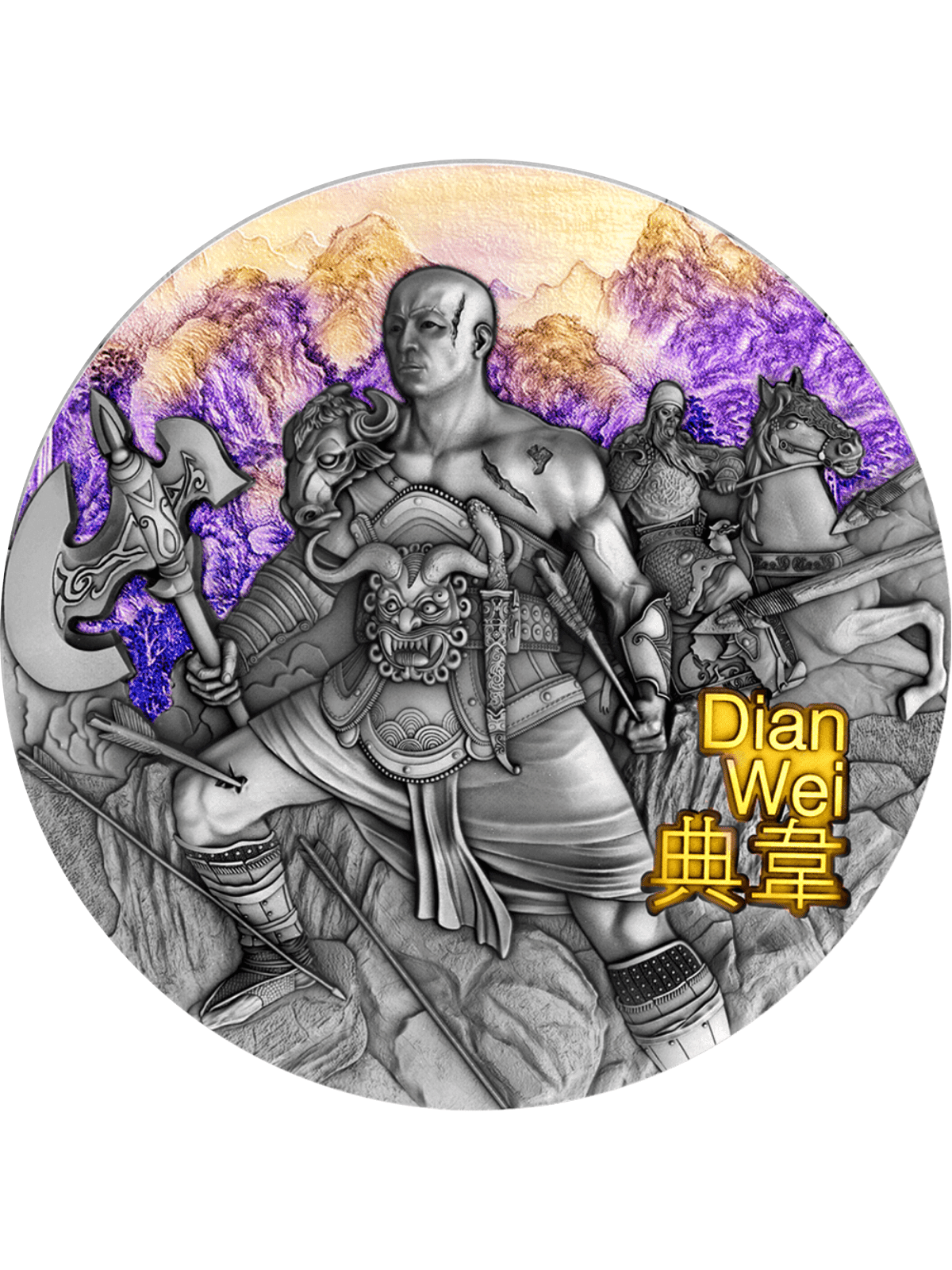 DIAN WEI Warriors of Ancient China Gold Plating 3 Oz Silver coin is the third issue from the “Warriors of China” series, dedicated to the Chinese warriors of the past. In this edition – Dian Wei. The coin presents wonderful and detailed Ultra High Reliefs, a selective Gold plating, a shimmering application, has an Antique Finish quality and comes in a case, along with the Certificate of Authenticity. Limited mintage of 500 pieces worldwide!
