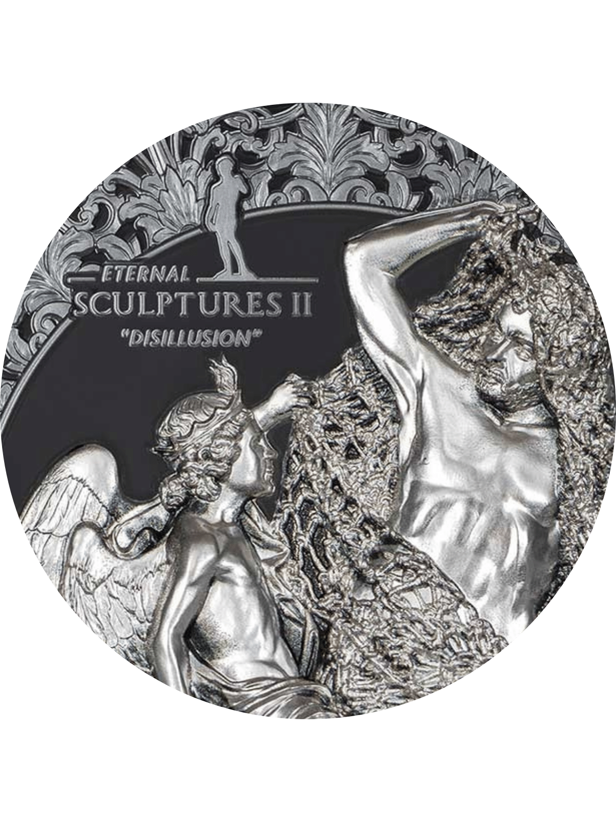 DISILLUSION 3 Oz Silver coin is the second release in the "Eternal Sculptures II" series, dedicated to the most famous and beautiful sculptures. In this issue: Disillusion, also known as "The Release from Deception". The coin features Smartminting Ultra High Relief on both sides, has Black Proof quality and comes in a case, along with the Certificate of Authenticity. Limited mintage of 499 pieces!