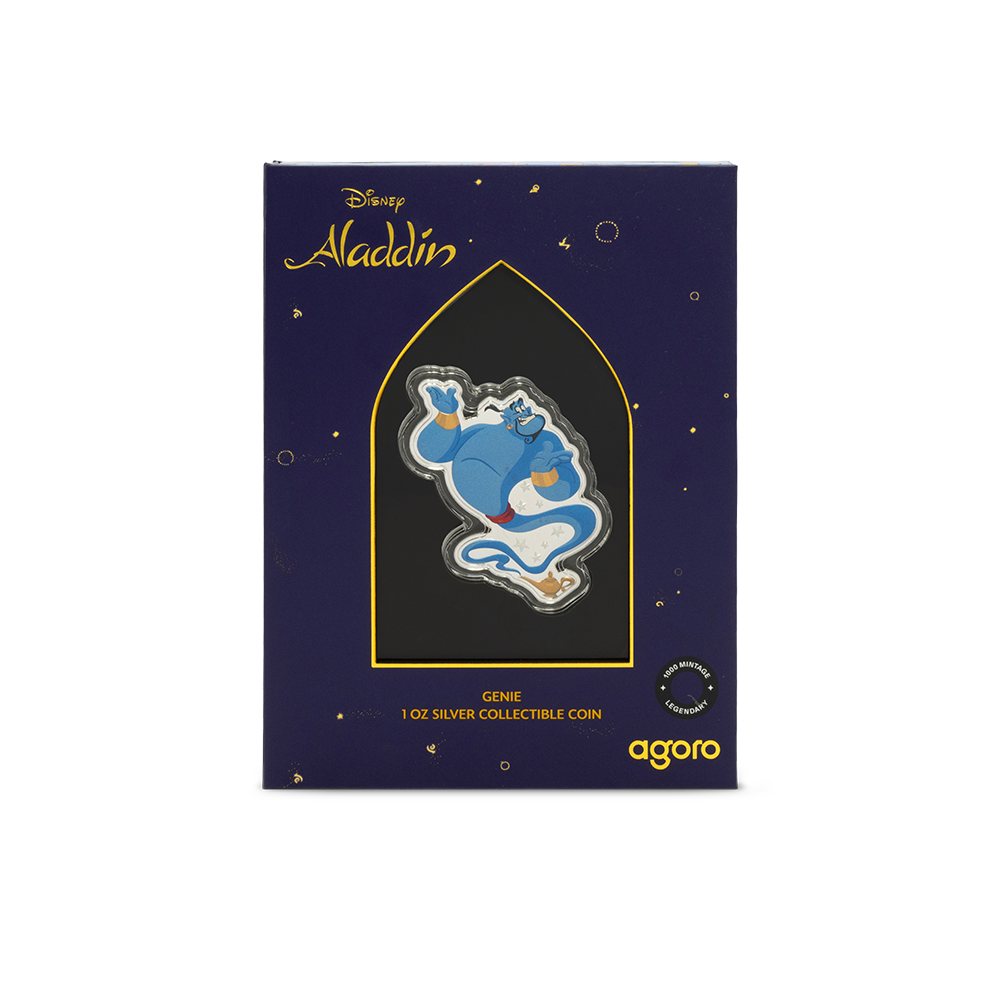 “Phenomenal cosmic powers… itty bitty living space!” This officially licensed silver collectible captures the Genie from Disney’s Aladdin in iconic cartoon style, shaped and colored with vibrant detail. Struck from 1 oz of 999 pure silver, the piece showcases Genie’s playful grin and electric blue form in proof/coloured finish. A Legendary Mintage release, it’s limited to just 1,000 pieces worldwide. Each coin is individually numbered on the back and features the Public Seal of Niue, making it legal tender. Presented in themed Aladdin packaging with a display window and a Mark of Authenticity, this coin is a bright wish come true for collectors.