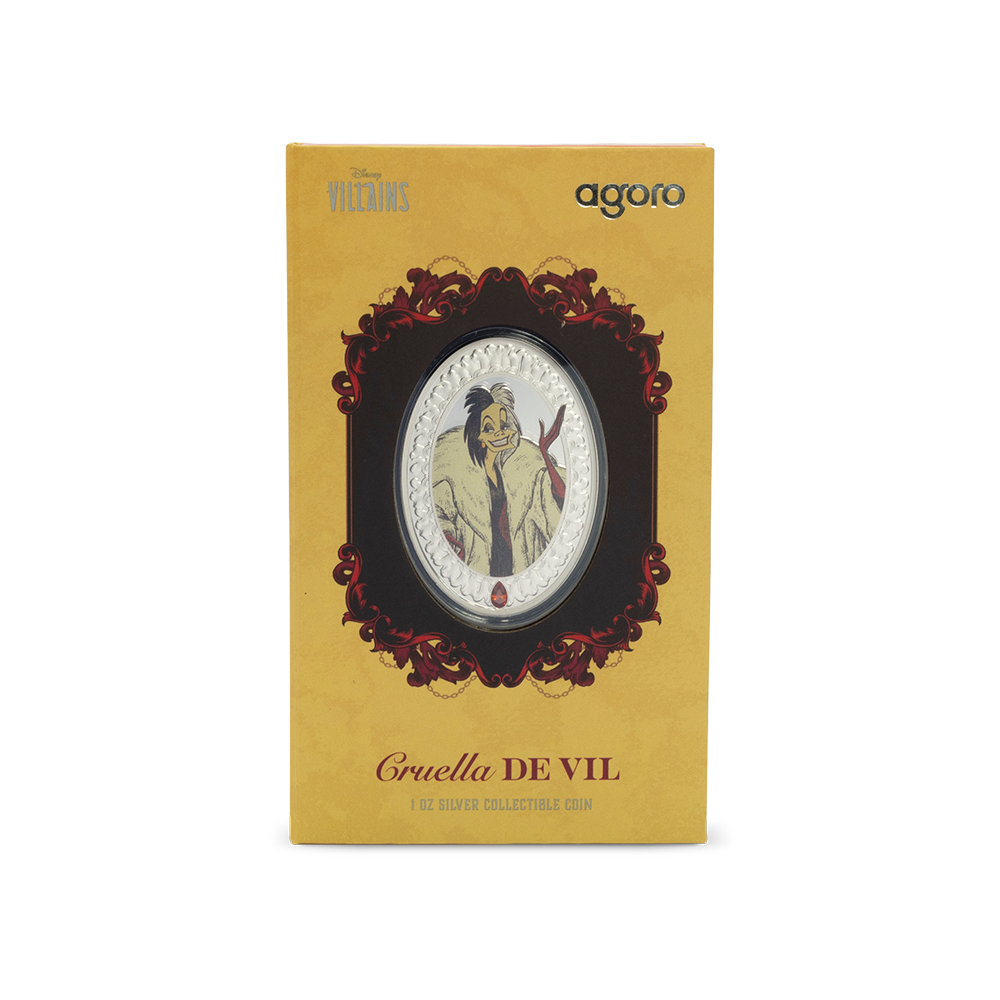 Cruella De Vil takes centre stage in this bold 1 oz 999 pure silver coin, part of the Disney Villains series. Her striking two-tone hair, dramatic fur coat ambitions, and wicked stare are captured in full color against a finely engraved backdrop that embodies her flamboyant villainy. With up to 2,000 pieces minted, this collectible balances menace and elegance in equal measure—officially licensed and made for display, gifting, or making a power statement.
