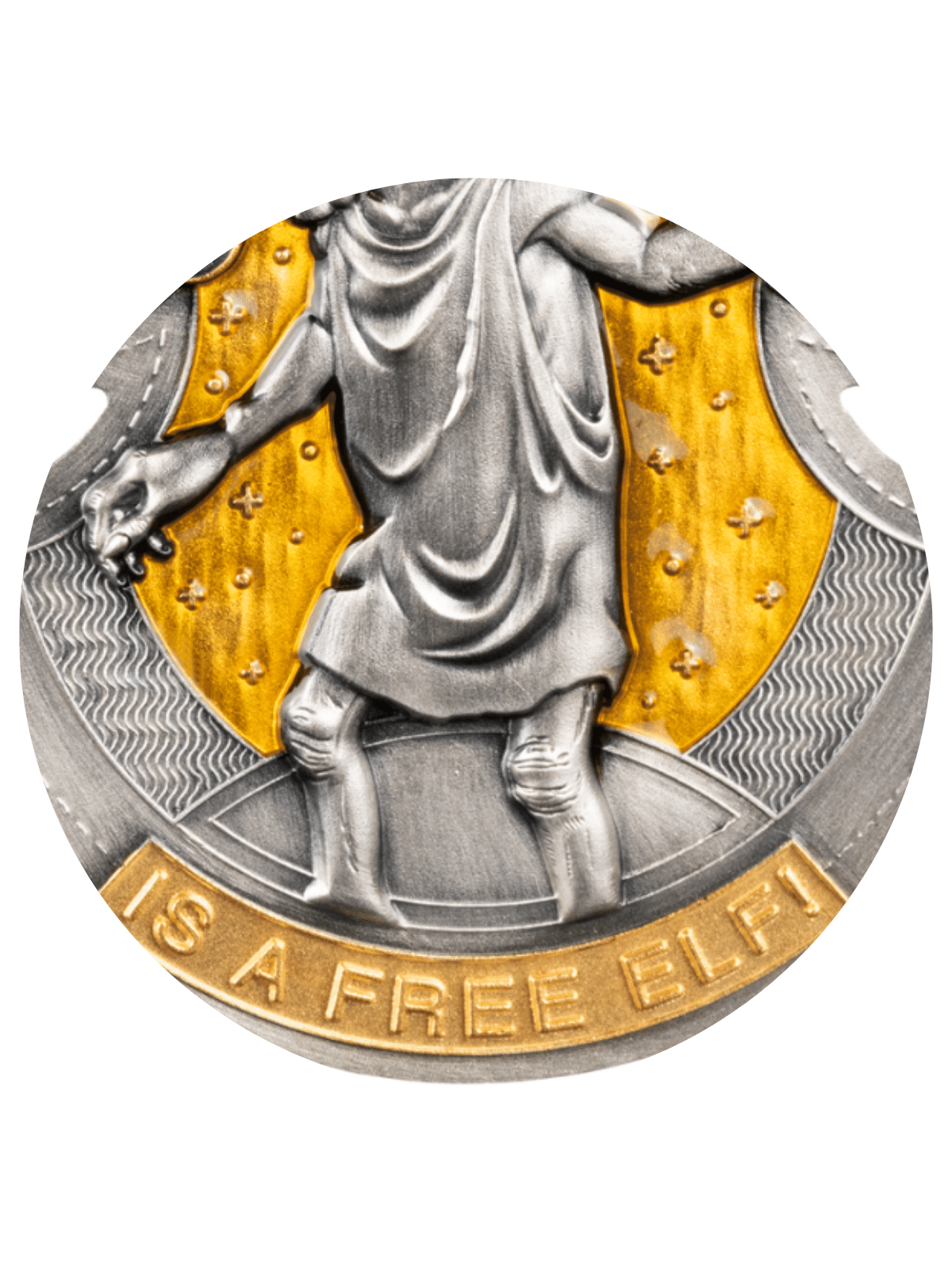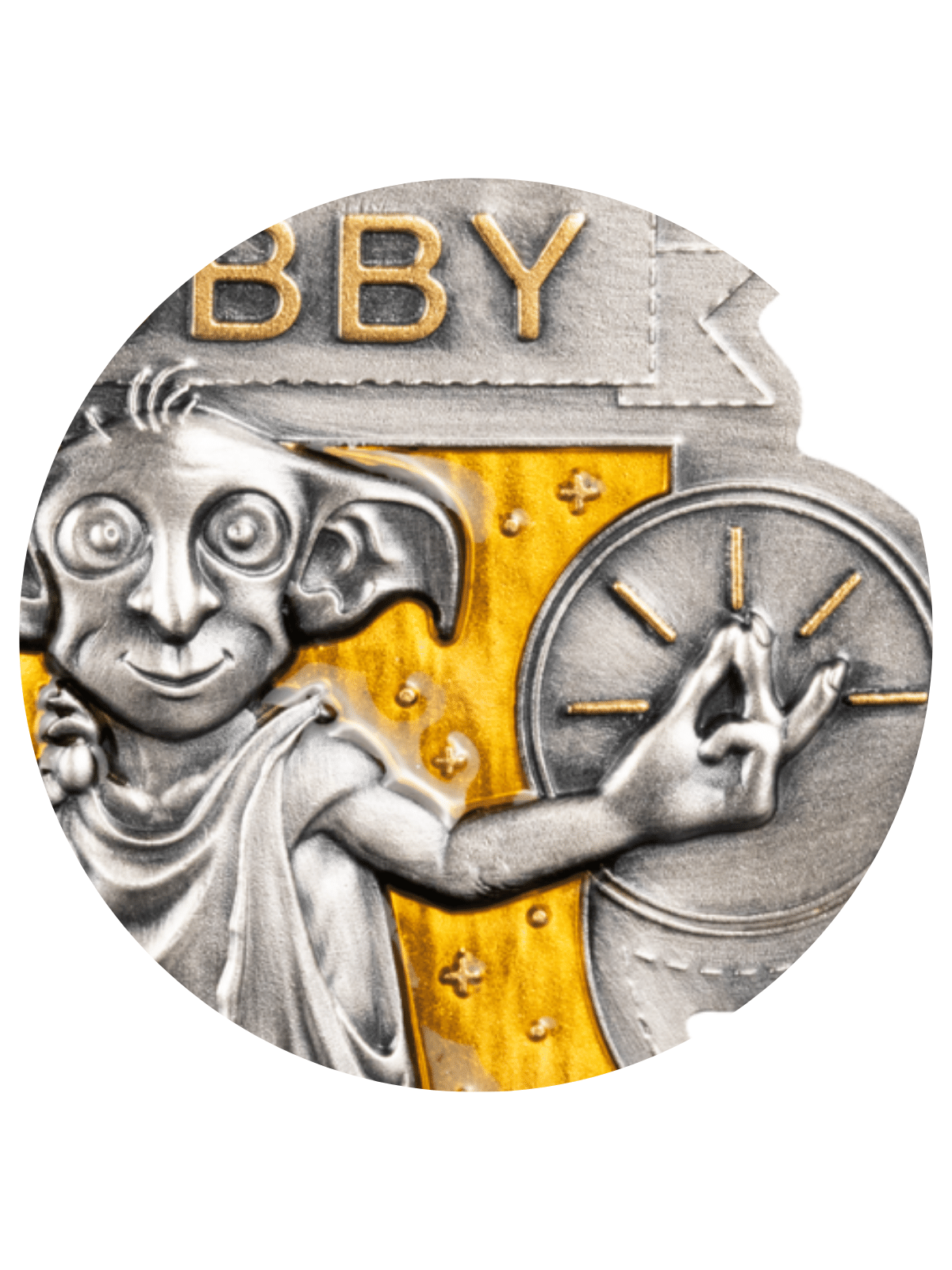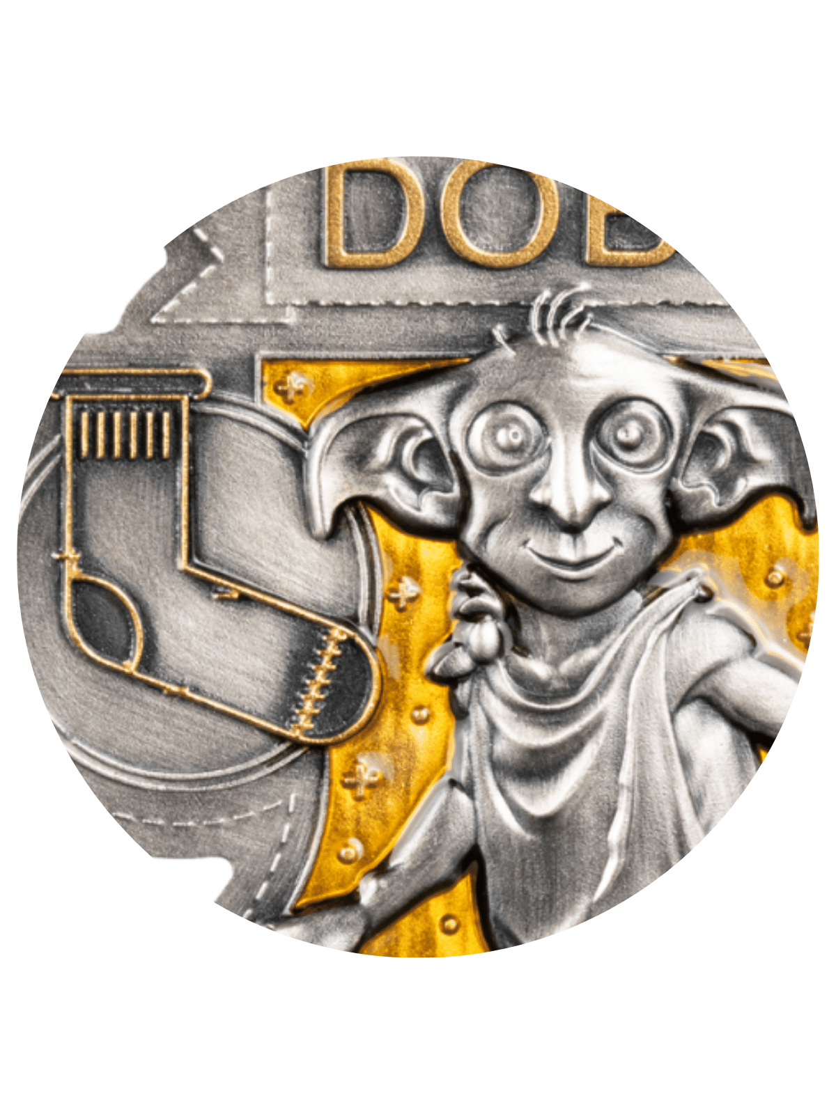 DOBBY Harry Potter 10 Oz Silver coin is dedicated to Dobby of House Elf from the popular book of Harry Potter. The coin has a beautiful shaped, Antique Finish quality and 24k Gold plating & enamal application comes in a themed case, along with the Certificate of Authenticity. Limited mintage of only 1499 pieces worldwide!