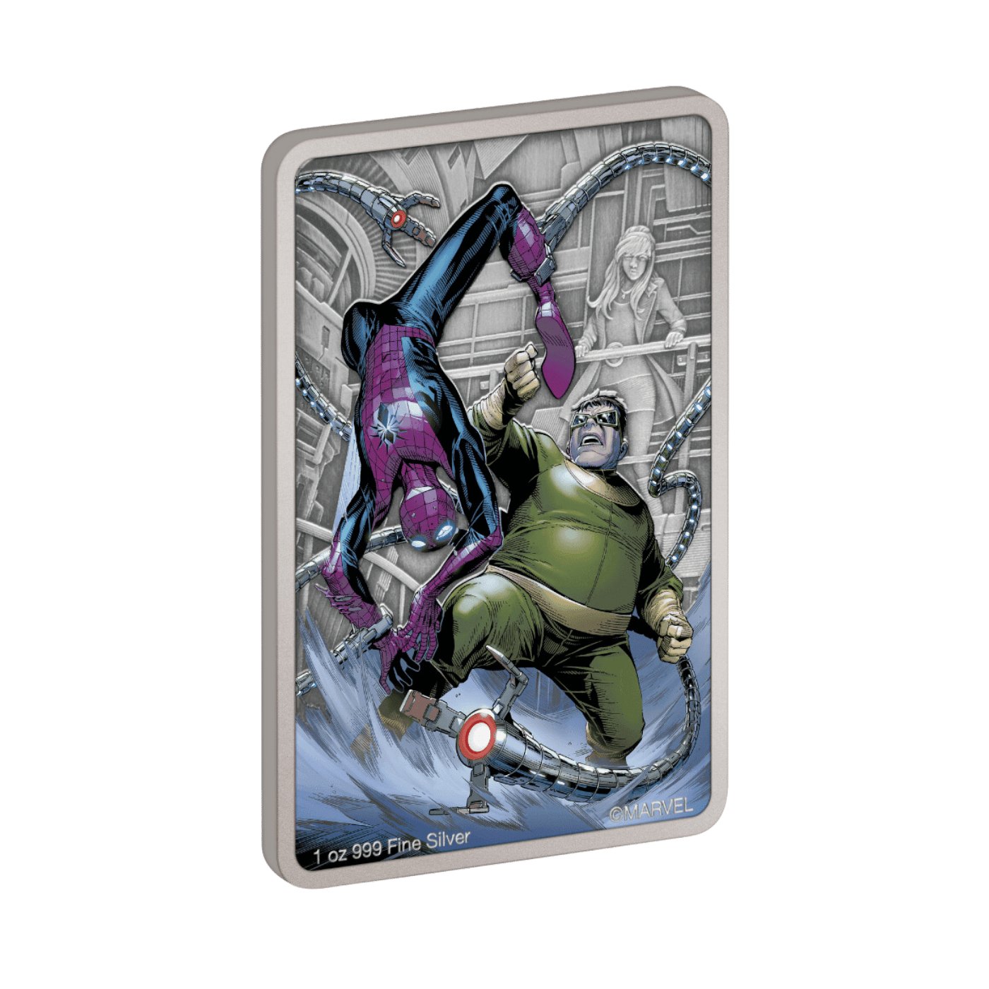 - The rectangular coin displays a glossy coloured image of Doc Ock poised for action with his mechanical tentacles outstretched, holding Spider-Man.