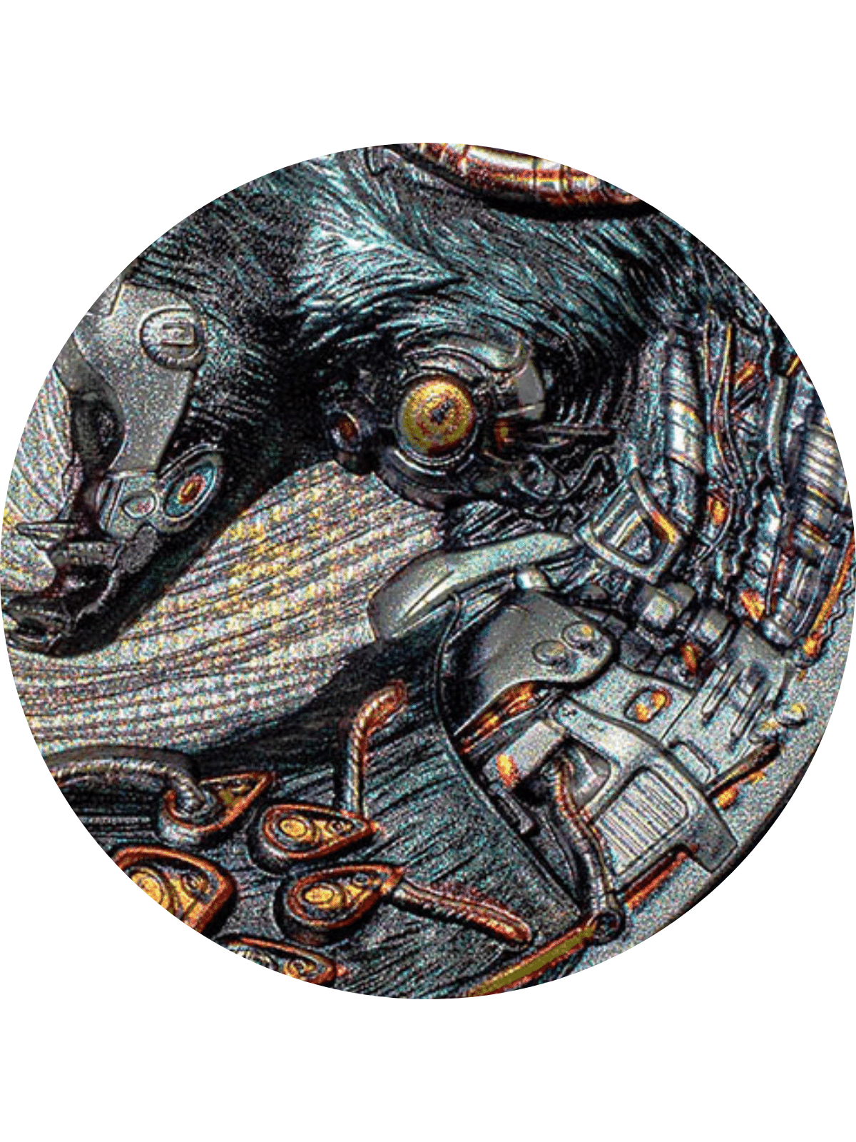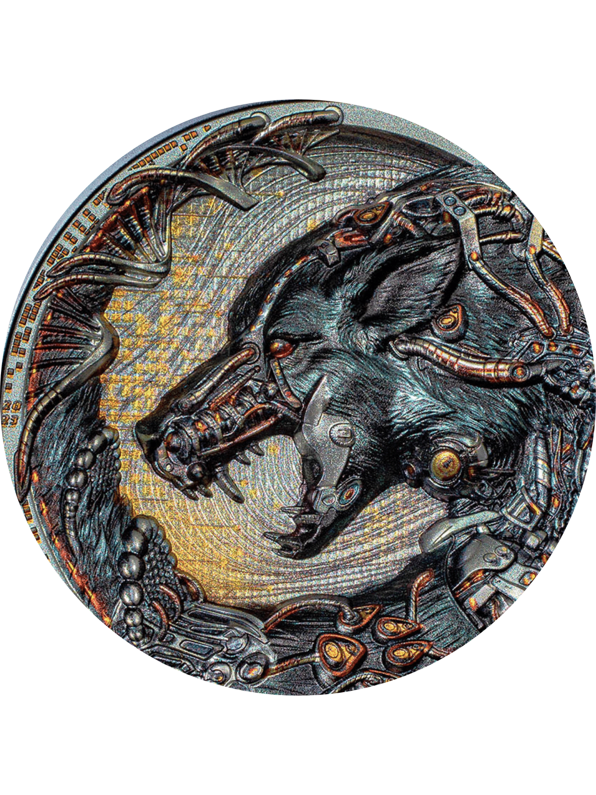 DOG Cyborg Revolution 3 Oz Silver coin is the third issue of “Cyborg Revolution”, the series that tells the story of a Cyborg invasion. In this edition: Cyborg Dog. The coin features impressive Smartminting Ultra High Relief, has Black Proof quality, has a vivid coloration and comes in a case, along with the Certiticate of Authenticity. Limited mintage of 499 pieces!