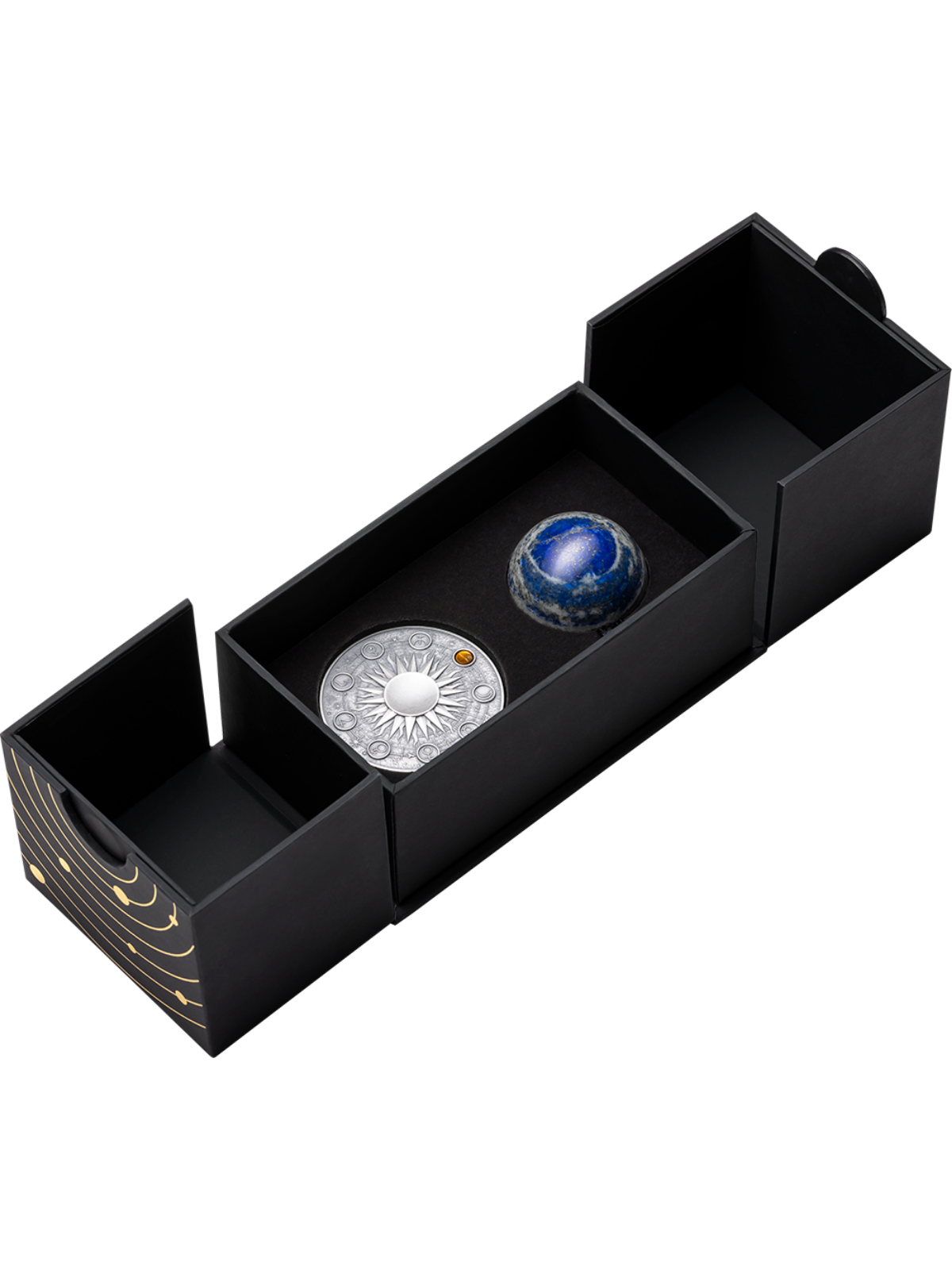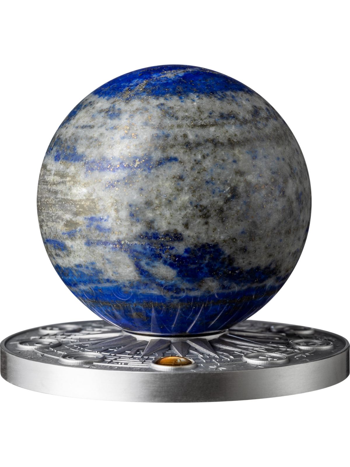 Discover the 'EARTH Solar System 2 Oz Silver Coin,' featuring a stylized sun and digitally gilded Earth, paired with a Lapis Lazuli Sphere