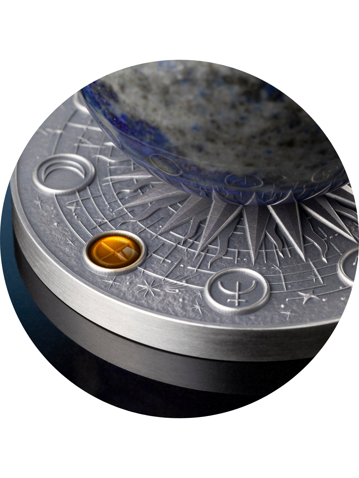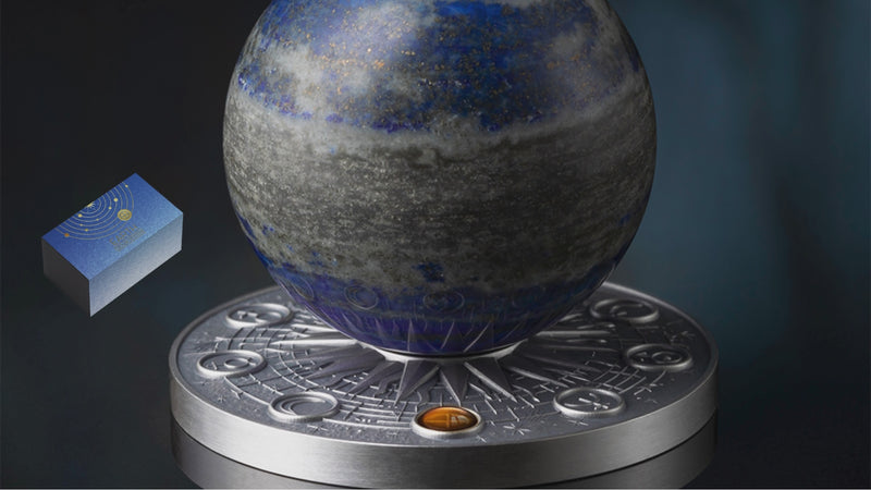 EARTH Solar System 2 Oz Silver Coin is part of the impressive "Solar System" series. This series features each planet from our system. In this edition: Earth. The coin has an Antique Finish quality with High Relief and a Lapis Lazuli Sphere of 35mm. It comes in a beautiful themed premium case, along with its Certificate of Authenticity. Limited mintage of only 500 pieces worldwide.