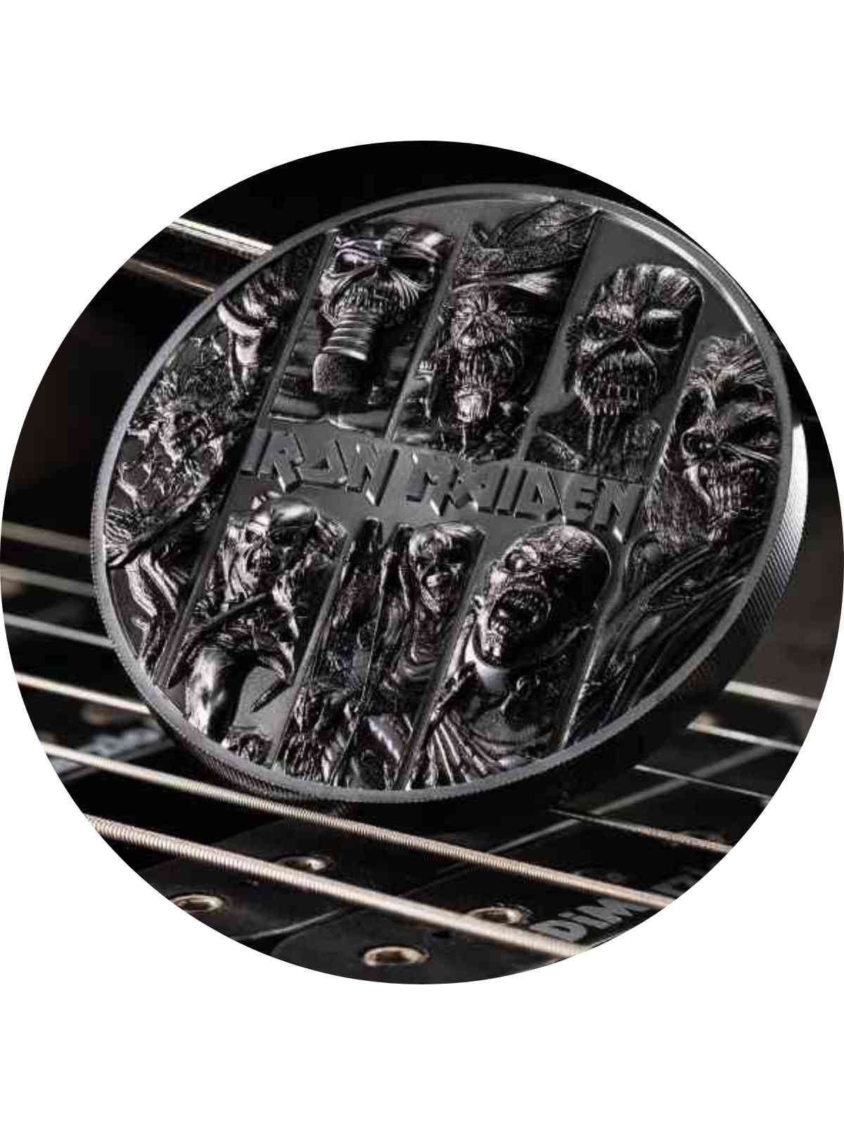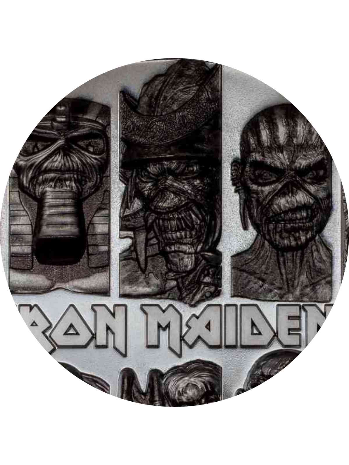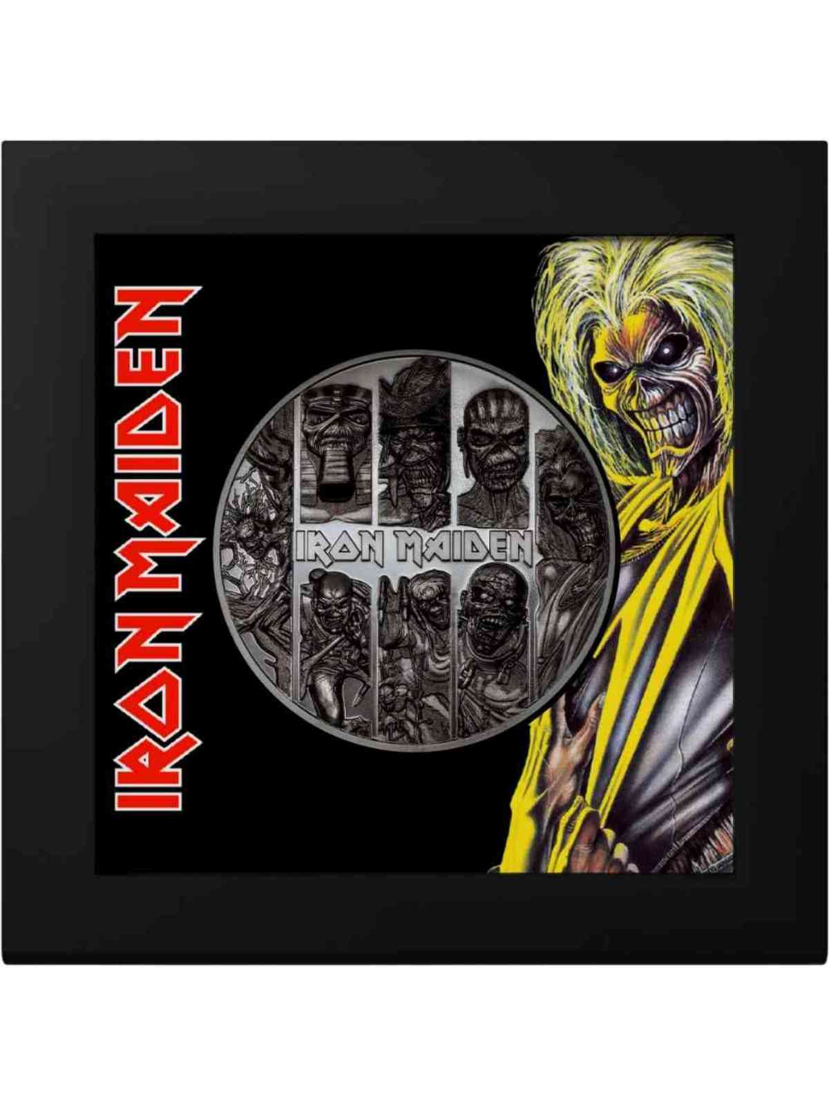 This 3 Oz Silver Coin from the Cook Islands celebrates Eddie, the iconic mascot of the legendary heavy metal band Iron Maiden. For over 40 years, Eddie has embodied the band's rebellious spirit, transforming into various roles like warrior, soldier, and pharaoh with each album. This special 2024 coin compiles the "Best of Eddie" from previous Iron Maiden releases, featuring a dark Black Proof finish and stunning smartmintingĀ® ultra high relief. It comes in an elegant case with a Certificate of Authenticity, limited to just 666 pieces worldwide!