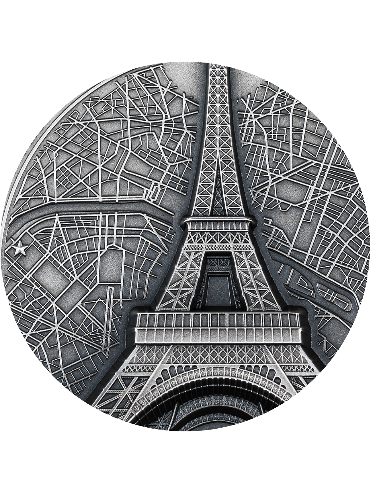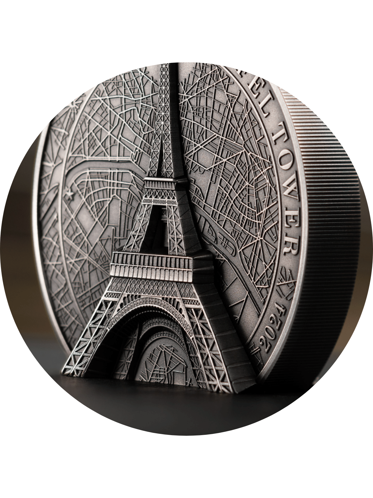 EIFFEL TOWER Silver coin is dedicated to the Eiffel Tower, one of the most famous symbols of Paris. The coin has a wonderful design, has Antique Finish quality and comes in a wonderful case, along with the Certificate of Authenticity. Limited mintage of 889 pieces worldwide.