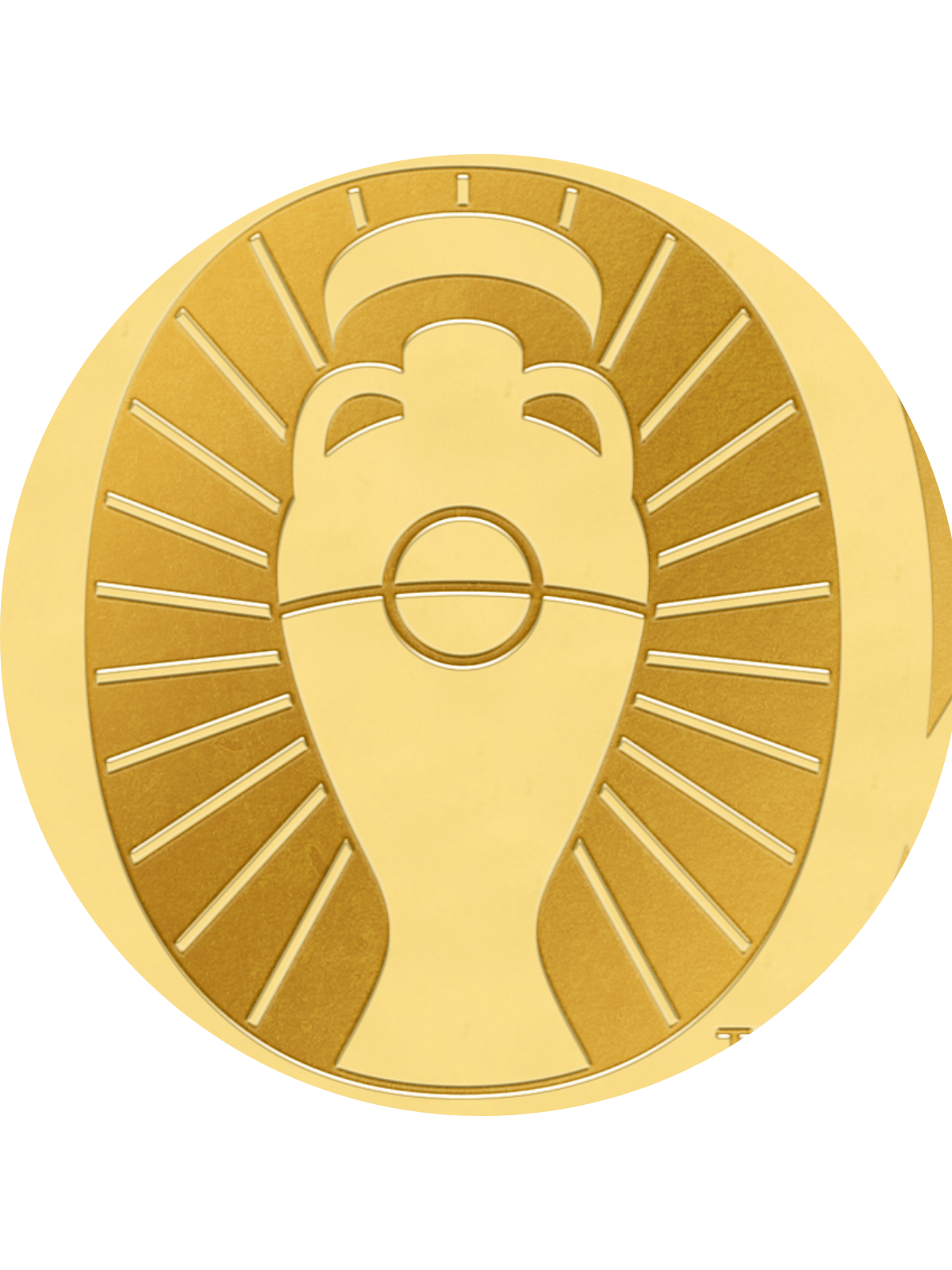 Tiny and shiny must haves: The affordable UEFA EURO 2024™ Small Gold Coins are struck from 0.5 g pure Gold .9999 and feature two motifs: The official Emblem and the noble Henri Delaunay Cup - the official Winner's Trophy!