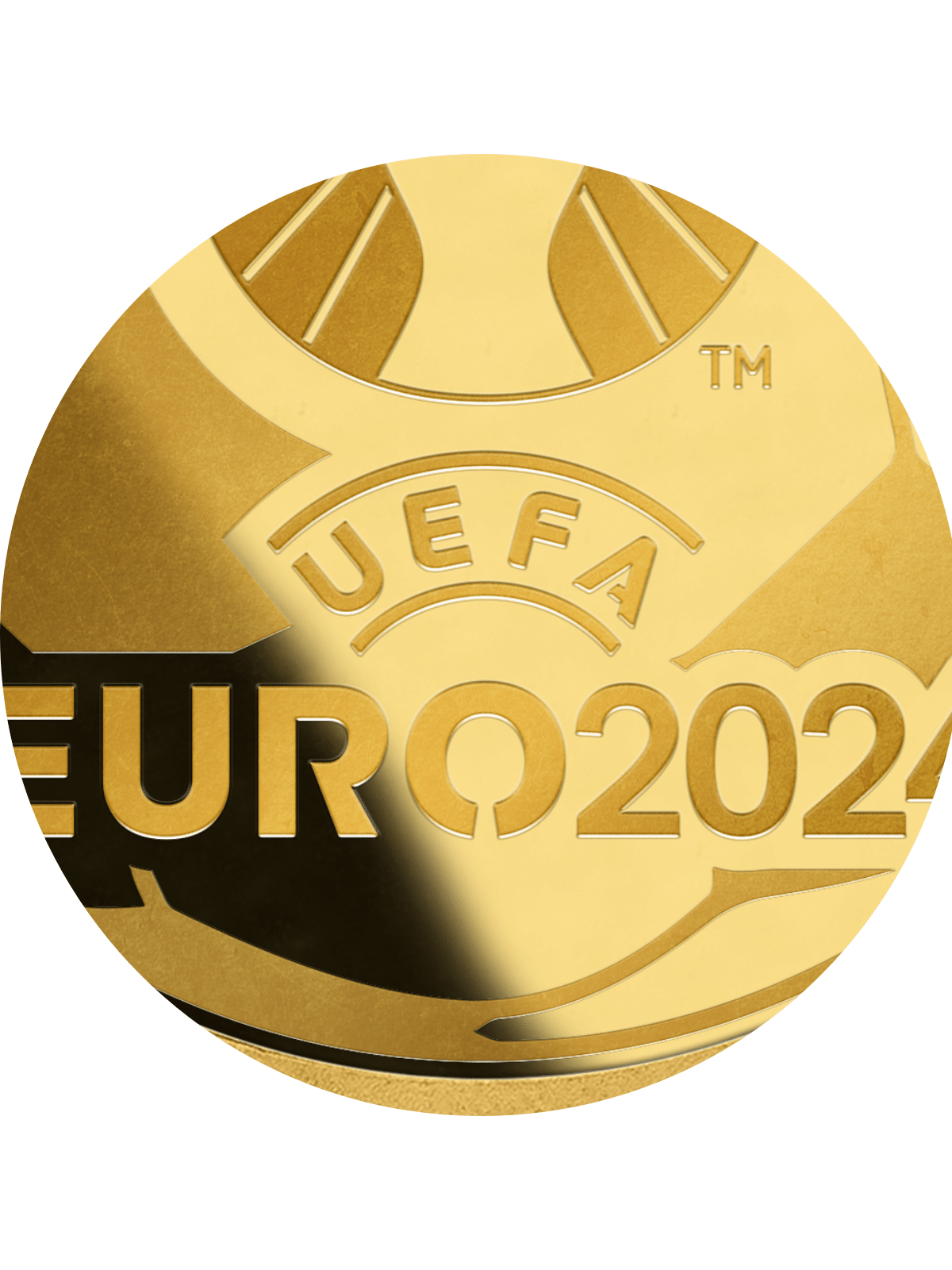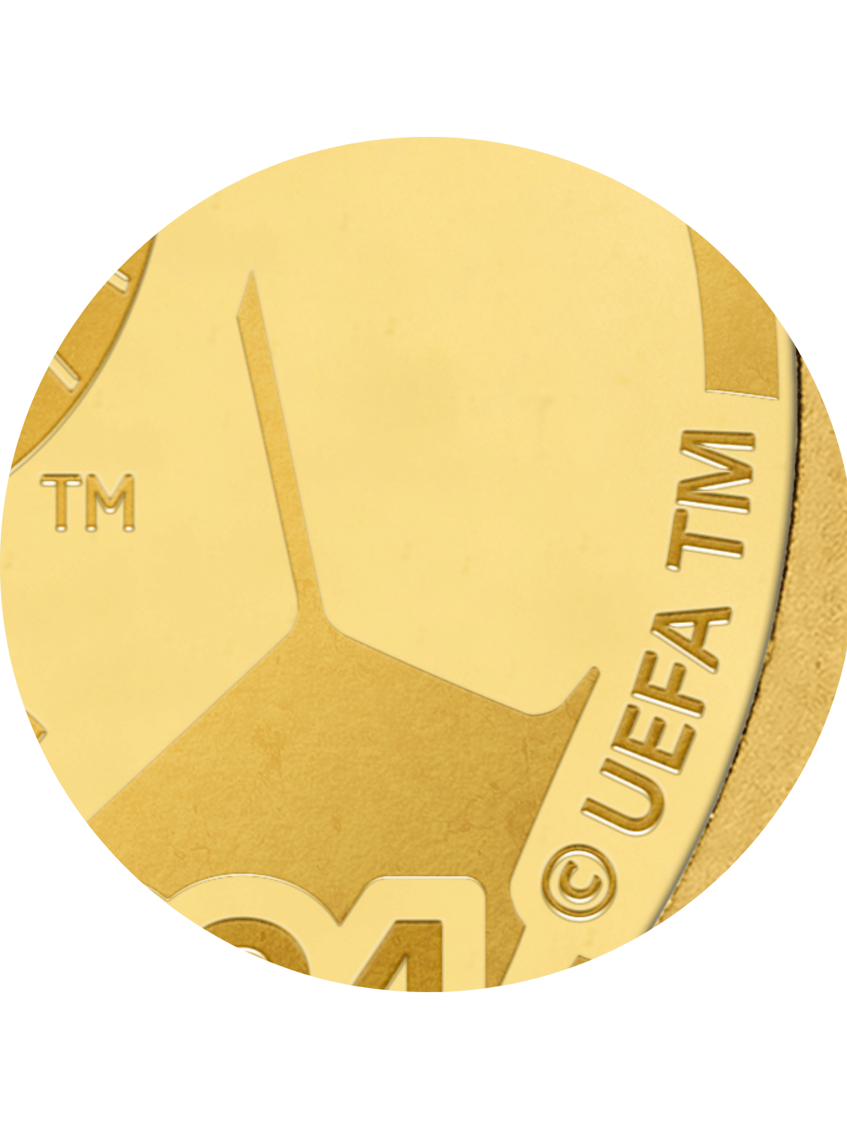 EMBLEM UEFA Euro Cup Gold coin honours the UEFA Euro Cup emblem. The coin has Proof quality and features a wonderful design with the official emblem for the championship at its center! It comes in a capsule. Limited mintage of only 9999 pieces worldwide!