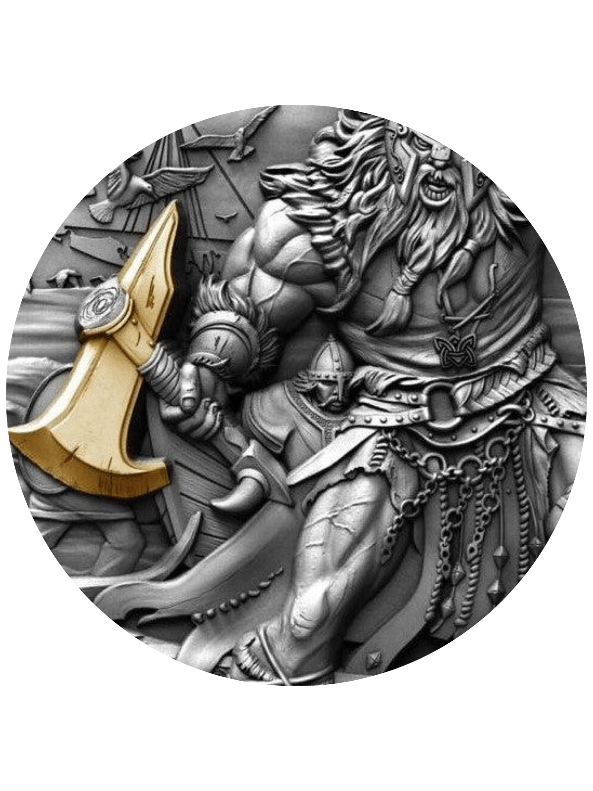ERIC BLOODAXE Vikings 2 Oz Silver coin is the first issue in the new “Vikings” series, dedicated to the Eric Bloodaxe, a Norwegian ruler who lived during the 10th century. The coin presents Ultra High Reliefs, a selective Gold plating, an Antique Finish quality and comes in a case, along with the Certificate of Authenticity. Limited mintage of only 500 pieces worldwide!