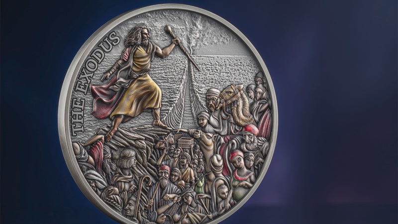 EXODUS Fundamental Stories of the Bible 5 Oz Silver Coin is the new issue in the "Fundamental Stories of the Bible" series and is inspired by the story of the exodus of Moses and his people. The coin has Antique Finish quality, is coloured, has incredible High Reliefs and comes in an elegant wooden case, along with the Certificate of Authenticity. Limited mintage of only 299 pieces worldwide.