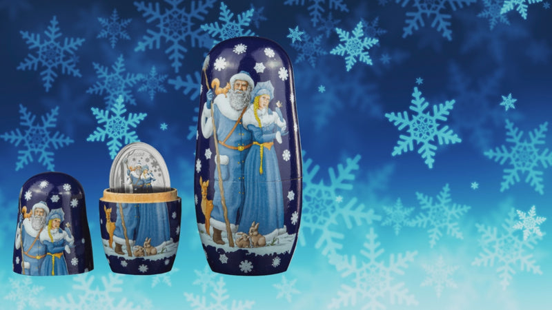 FATHER FROST SNOW MAIDEN Matrioshka Doll 1 Oz Silver coin is dedicated to the Russian version of the Santa Claus and his granddaughter Snow Maiden. The coin features the special egg-shaped curve of a real Russian Matryoshka Doll, has a beautiful coloration and comes in a two-sized Matryoshka case, along with the Certificate of Authenticity. Limited mintage to 5000 pieces worldwide!