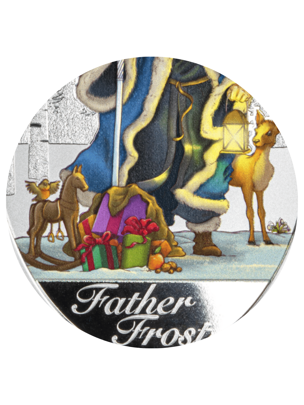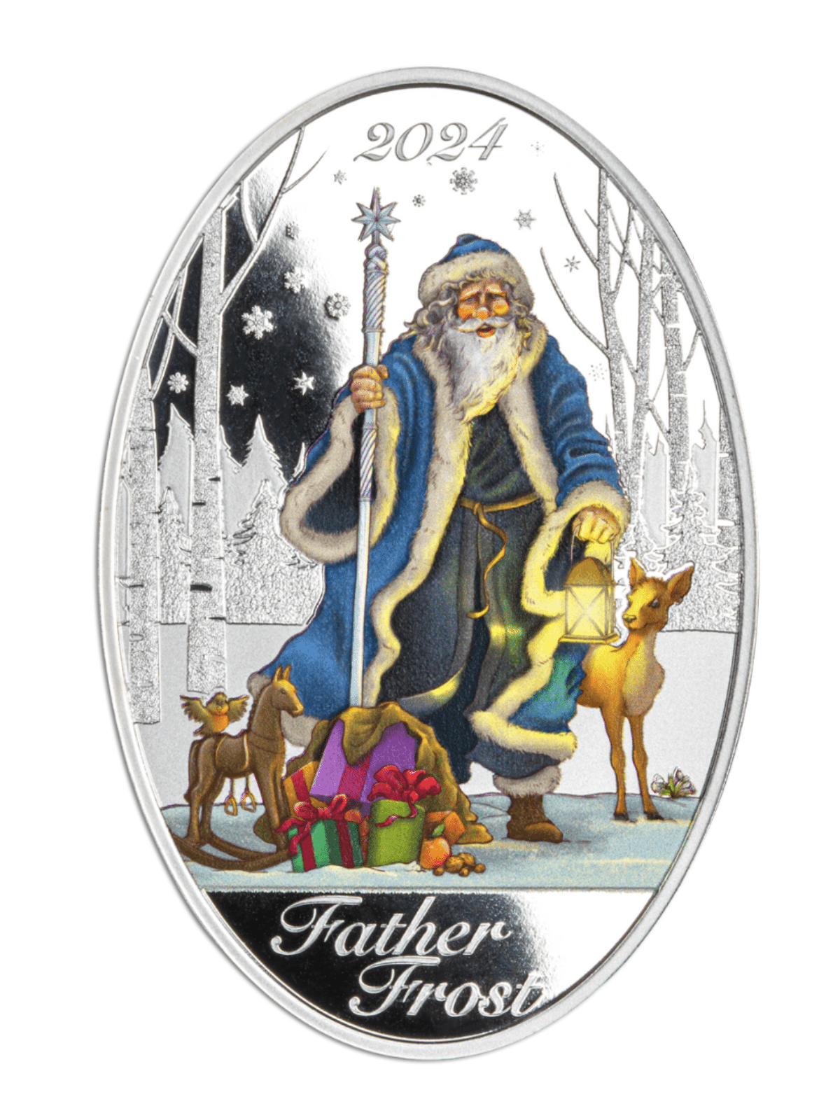 The 2024 Father Frost edition features an elegant oval shape and selective colour application. Each coin is individually numbered.