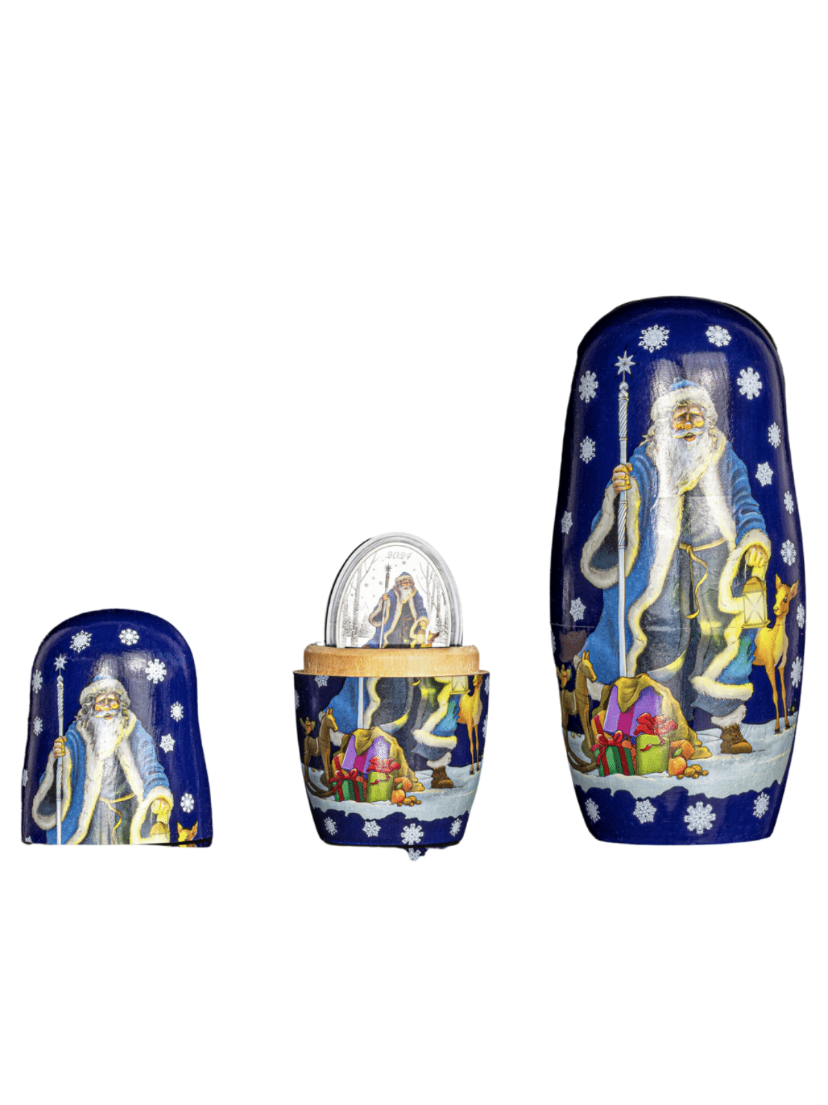 FATHER FROST 1 Oz Silver coin 2024 is dedicated to the traditional folklore version of the Santa Claus. The coin features the special egg-shaped curve with individual edge numbering, has a beautiful coloration and comes in a two-sized famous stacking doll packaging, along with the Certificate of Authenticity. Limited mintage to 5000 pieces worldwide!