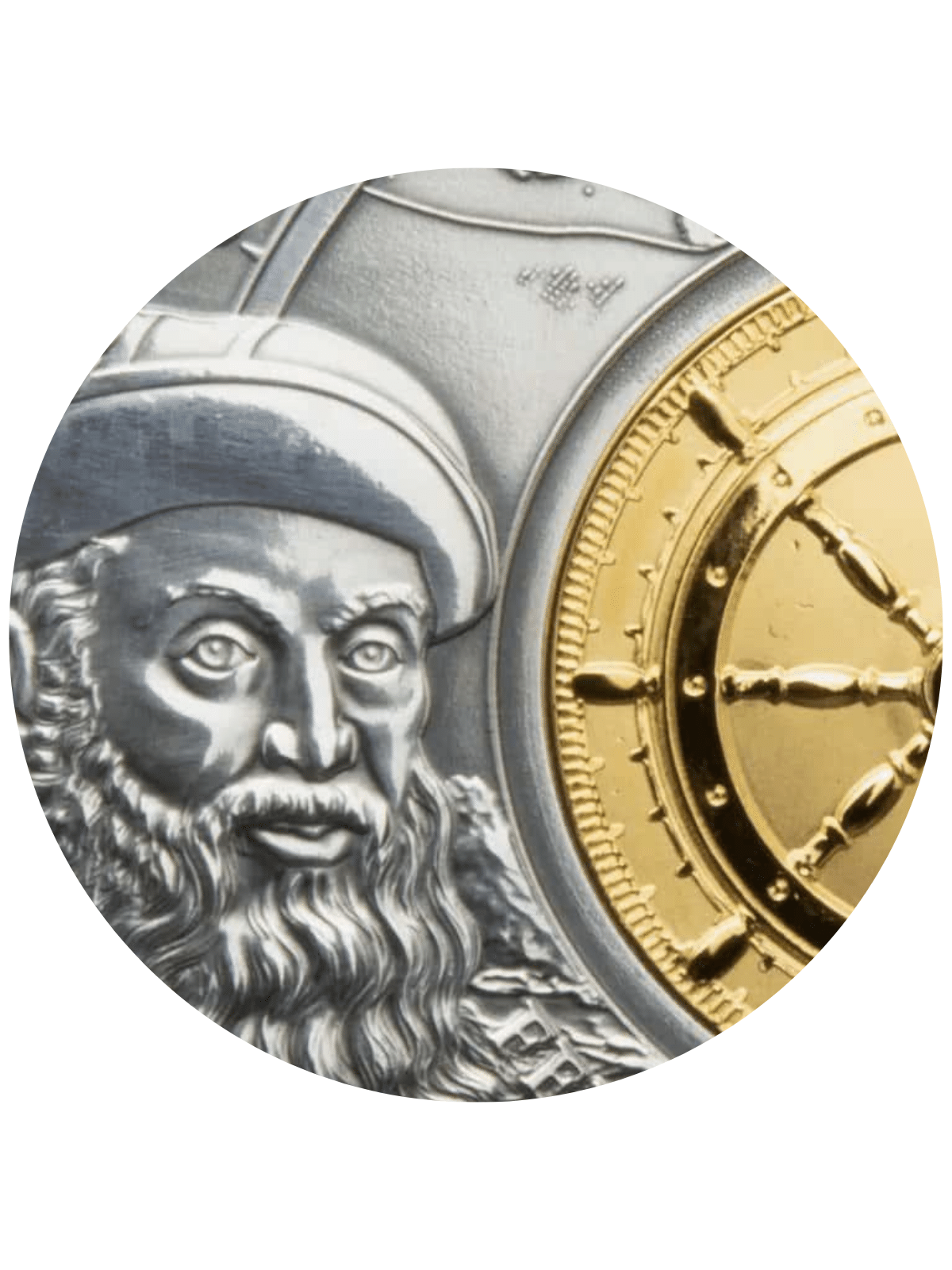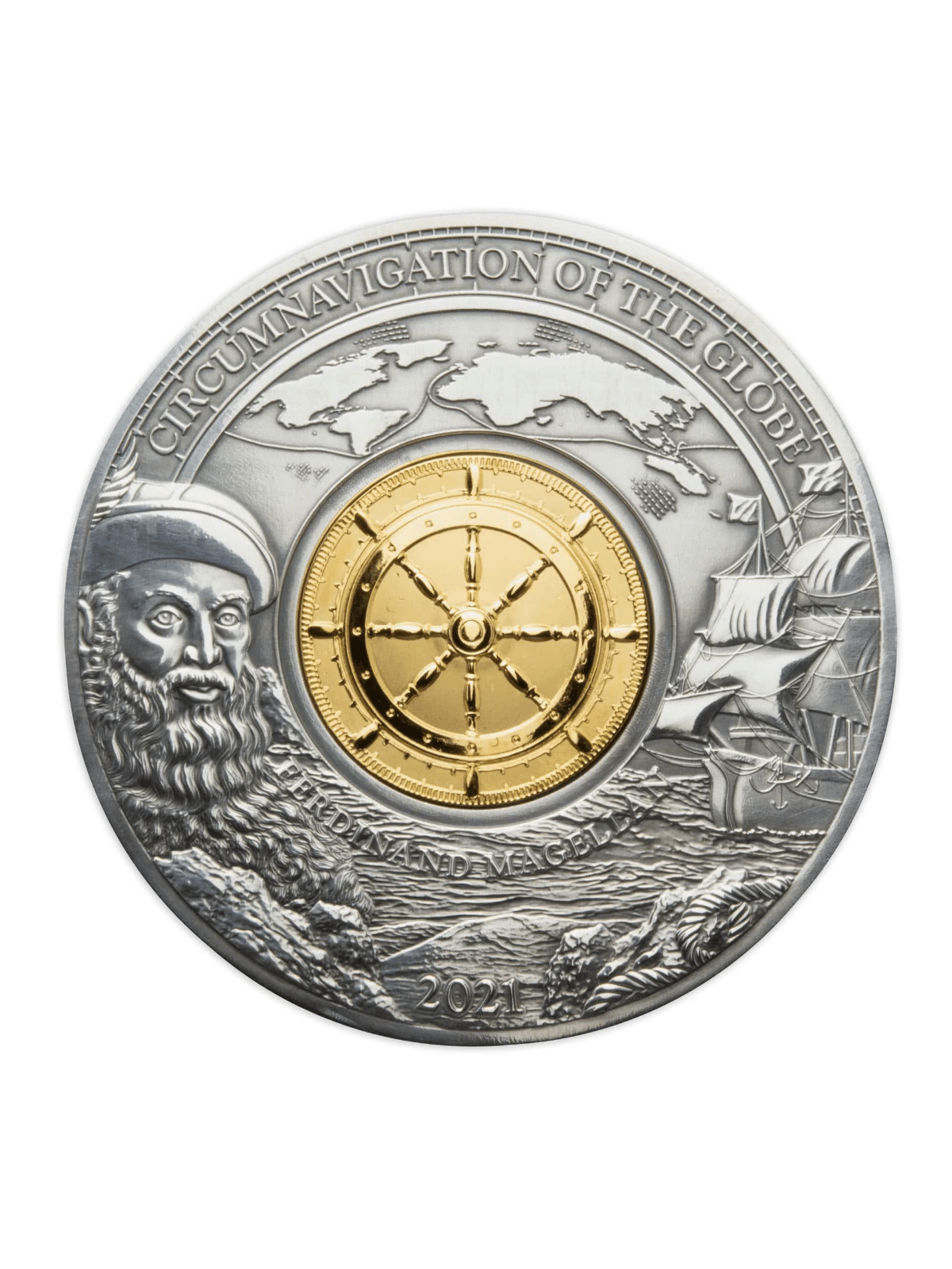 FERDINAND MAGELLAN 3 Oz Silver coin is dedicated to Ferdinand Magellan, the first human who sailed around the world. The coin has a Gold plated inlay with a marvellous design, has an Antique Finish quality and comes in a case, along with its Certificate of Authenticity. Limited mintage to 999 pieces worldwide!