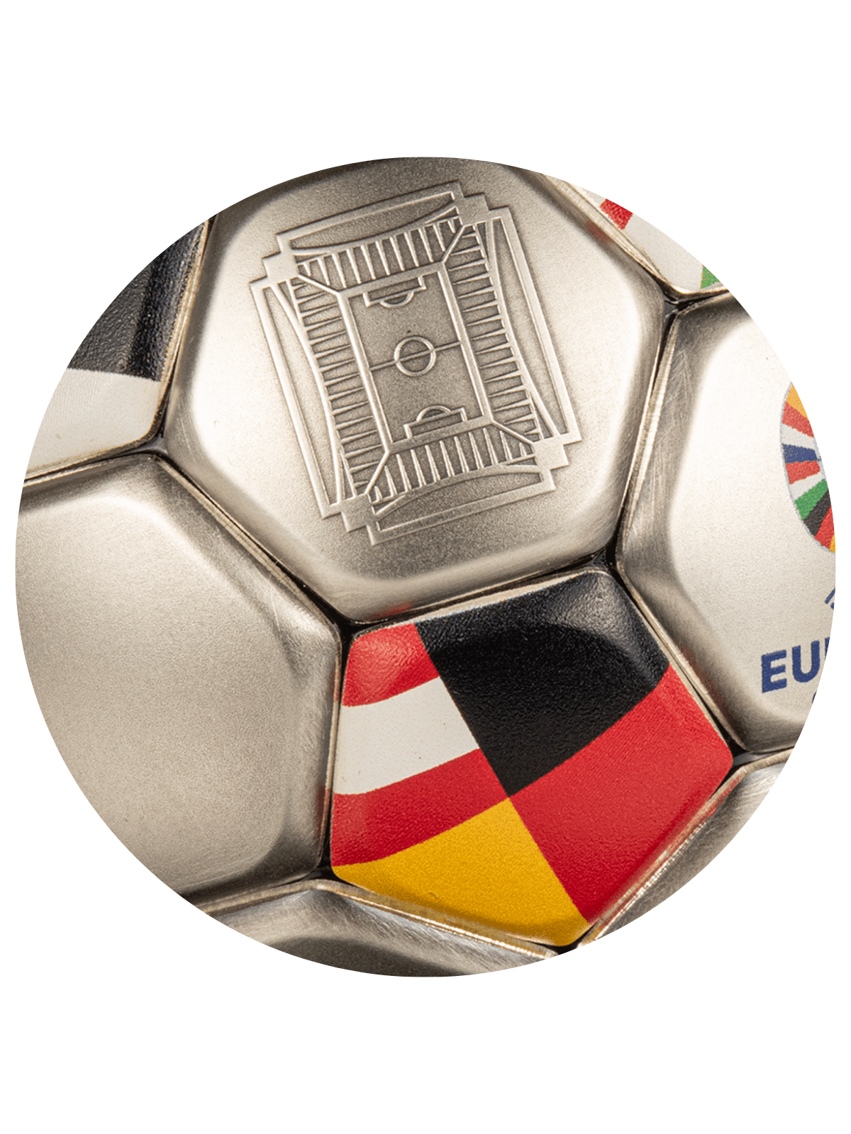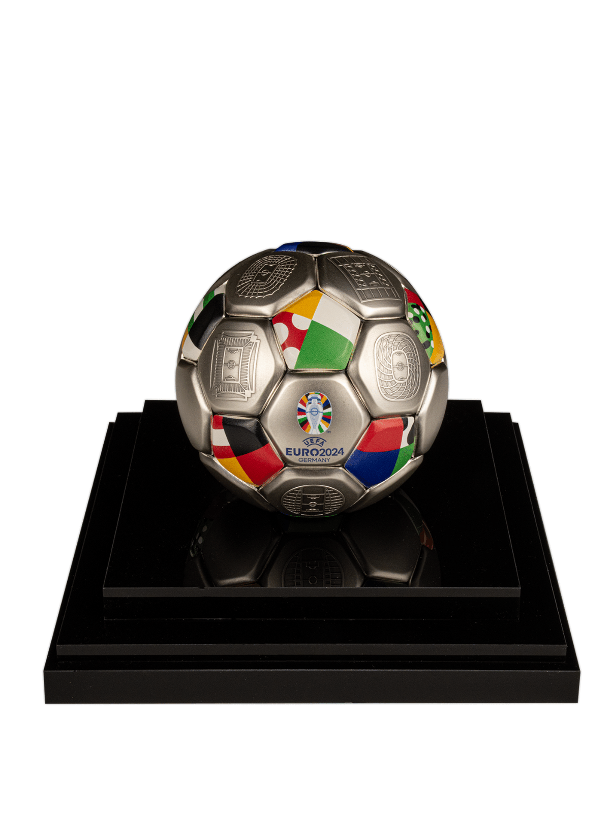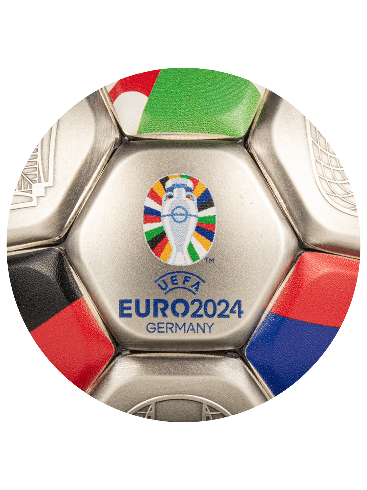 FOOTBALL UEFA EURO Spherical 3 Oz Silver coin is dedicated to the Football Uefa Euro 2024™. The design presents flags of different countries all around the surface of the coin, has a wonderful soccer ball-shape, with an Antique Finish quality and comes in a special display case, along with the Certificate of Authenticity. Limited mintage to only 2024 pieces worldwide!