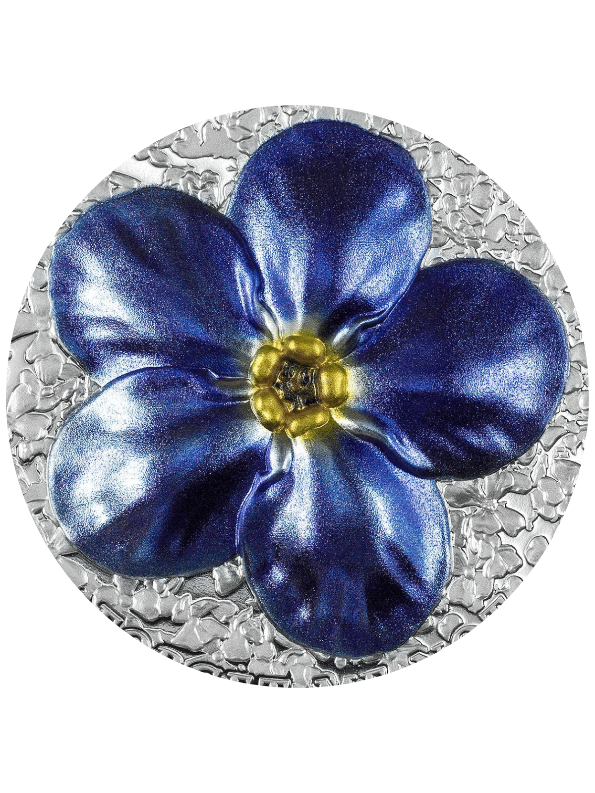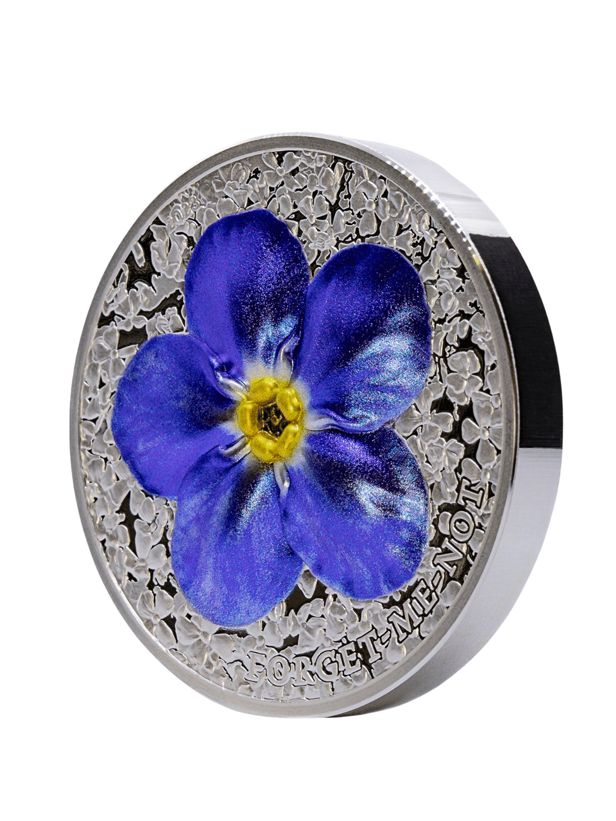 The "Forget Me Not" coin is the 5th issue in the "High Relief Flowers and Leaves" series. Using the enhanced ultra high relief Smartminting©️ technology makes the Forget Me Not pop out of the coin
