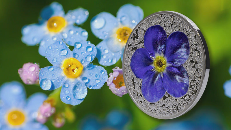 FORGET ME NOT 2 Oz Silver coin is the new issue in the "Flowers and Leaves" series and features the beautiful Forget Me Not flower. The coin has stunning colors and a Proof quality. It comes in a case, along with the Certificate of Authenticity. Limited mintage of 999 pieces worldwide!