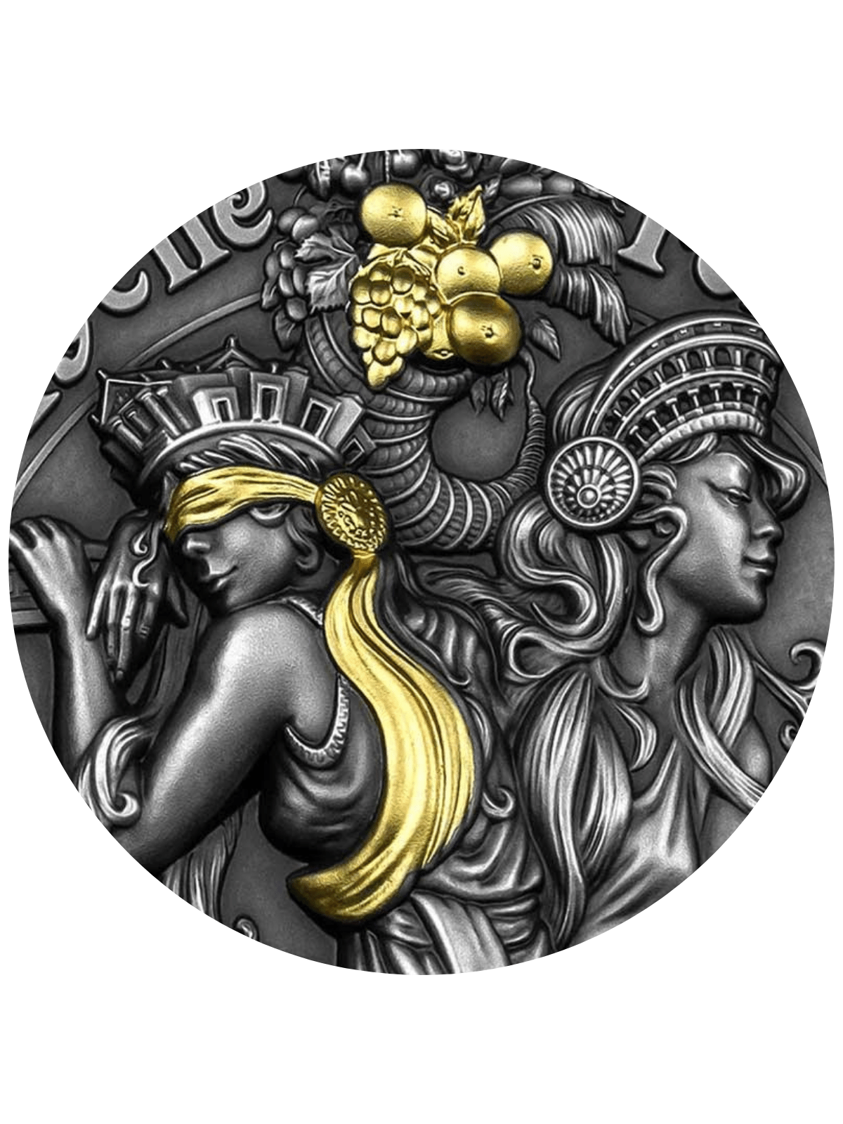 FORTUNA AND TYCHE Goddesses 2 Oz Silver coin depicts two goddesses, the Greek goddess of fortune, who guaranteed the prosperity and fate of a city, along with her Roman equivalent - the goddesses Tyche and Fortuna. The coin has a very High Relief, has a selective Gold plating, an Antique Finish quality and comes in a case, along with a Certificate of Authenticity. Limited mintage of only 500 pieces worldwide!